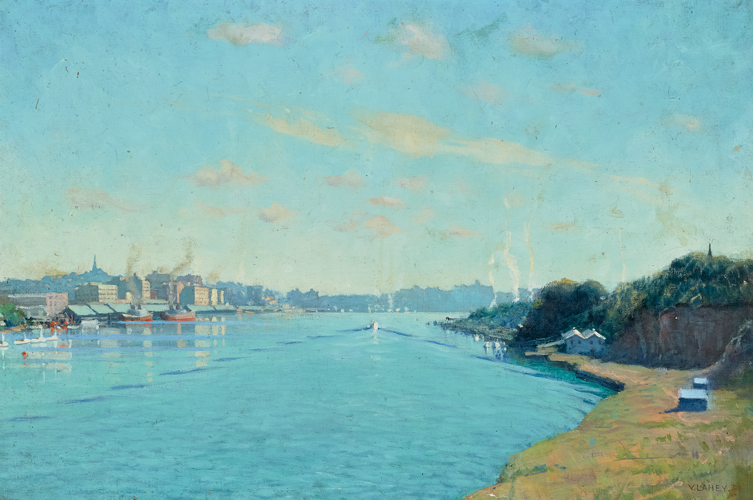 Vida Lahey’s exhibition at the Fine Arts Society’s Gallery in Melbourne in 1932 featured seventeen oil paintings, the second largest of which was Early morning, Brisbane River, 1932. It was an immediate hit with the critics. Harold Herbert, writing for The Age, considered the painting to be an oil of ‘high order ... an admirably painted stretch of land and blue water, spacey in conception, and simple yet convincing in treatment.’1 Blamire Young, in his review for The Herald, described Lahey as a ‘great colourist’, and that her evocation of the early morning riverscape was marked by its ‘pure light and the hush of dawn.’2 Arthur Streeton was also an admirer of the ‘fine qualities of light and air’ in her work,3 as was George Bell who considered her to be ‘an artist of consummate taste, an exquisite sense of colour, and a fine sense of composition.’4