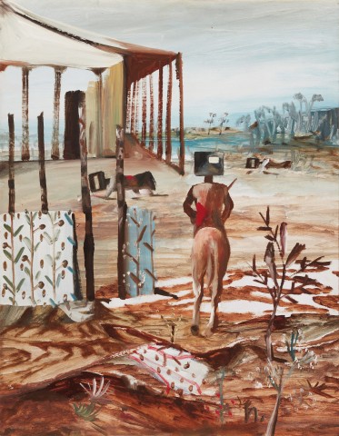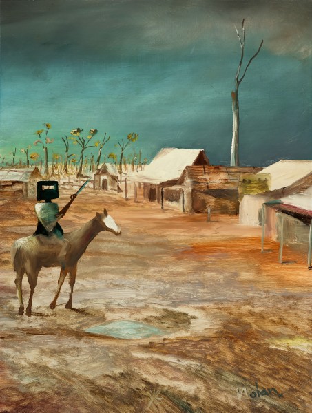 Within this spectrum, Early Morning Township, 1955 is an augury of the skirmish to come. Ned Kelly is seen studying the township in the cool light of morning. The town sleeps while Kelly, set to one side of the composition, sits astride his steed, rifle in hand. The outlaw is still but his dappled mount sniffs the air, perhaps sensing the danger to come. The composition can be read as the prelude to the violence of the Glenrowan Siege; a poignant moment as Kelly contemplates the polite society to which he will never belong. It is also a counterpoint to an important painting purchased in 1955 by the Museum of Modern Art, New York. Titled Glenrowan Siege, 1955, this work shows the ruined aftermath of the battle in which many of the Kelly Gang members were killed.