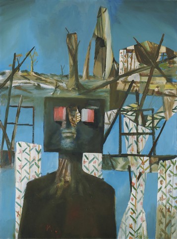 In the new Kelly series of 1954 – 55, the ‘naïve’ style has gone, and the invented shapes are intellectually more coherent and plastically more ingenious: the colours, unlike those of the earlier landscapes, are luminous, rich, and varied; while the presentation of the Kelly myth has gained a new magic and imaginative power. Nolan has given the hero his metallic face and body as he rides and strides through the enormous Bush, striking terror and constantly facing it. The mood of these pictures is sardonic, brutal, sad and tender. The story unfolds itself painfully and poetically in the successive episodes, and all the loss and sorrow of a rare young life thrown on to the scrap-heap are dignified, ennobled, and redeemed.5