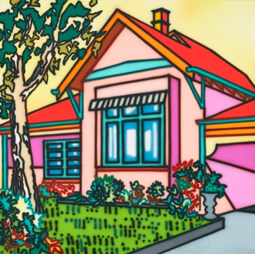 signed, dated and inscribed verso: Name Howard Arkley / Title Eastern Suburbs Pink Home / Date 1991 / Size 630 mm x 630 [sic.] mm / Medium Acryic [sic.] on Canvas