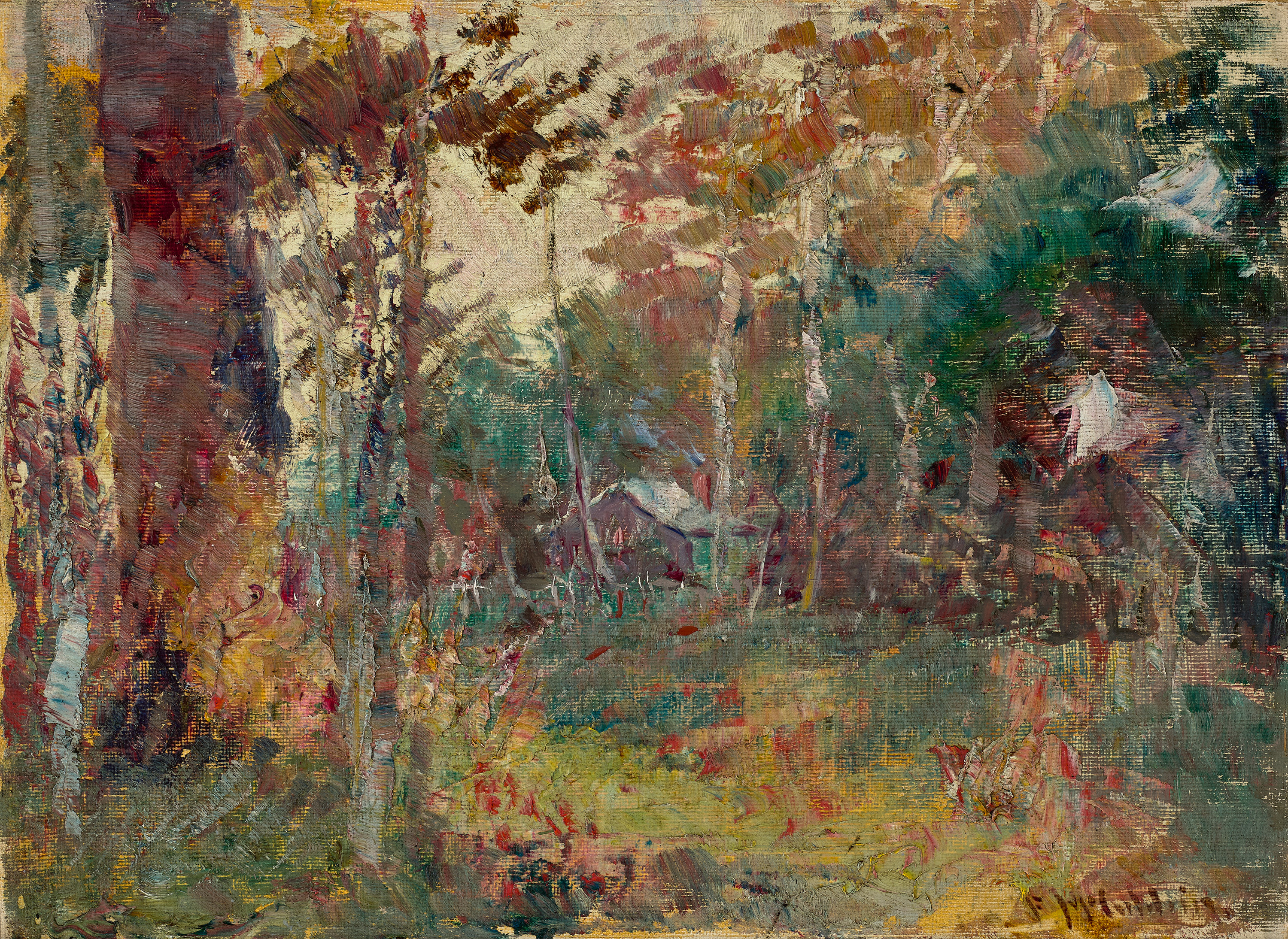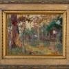 It is highly plausible that Edge of the Clearing is one of the studies done by Frederick McCubbin in preparation for his masterpiece The Pioneer, 1904 (National Gallery of Victoria). This monumental triptych has mesmerised audiences since its first display, a poignant tale of a pioneering family and the property they establish in the bush. At the rear of the central panel is the settlers’ cottage which bears a marked similarity to the one seen here, framed by large trees and partially obscured by saplings. The technique and setting also identifies Edge of the Clearing as being painted before 1907, when McCubbin went to Europe, radically changing his style on return. It further bears a marked similarity to the bush around the artist’s family home ‘Fontainebleau’ at Mt Macedon, north of Melbourne.