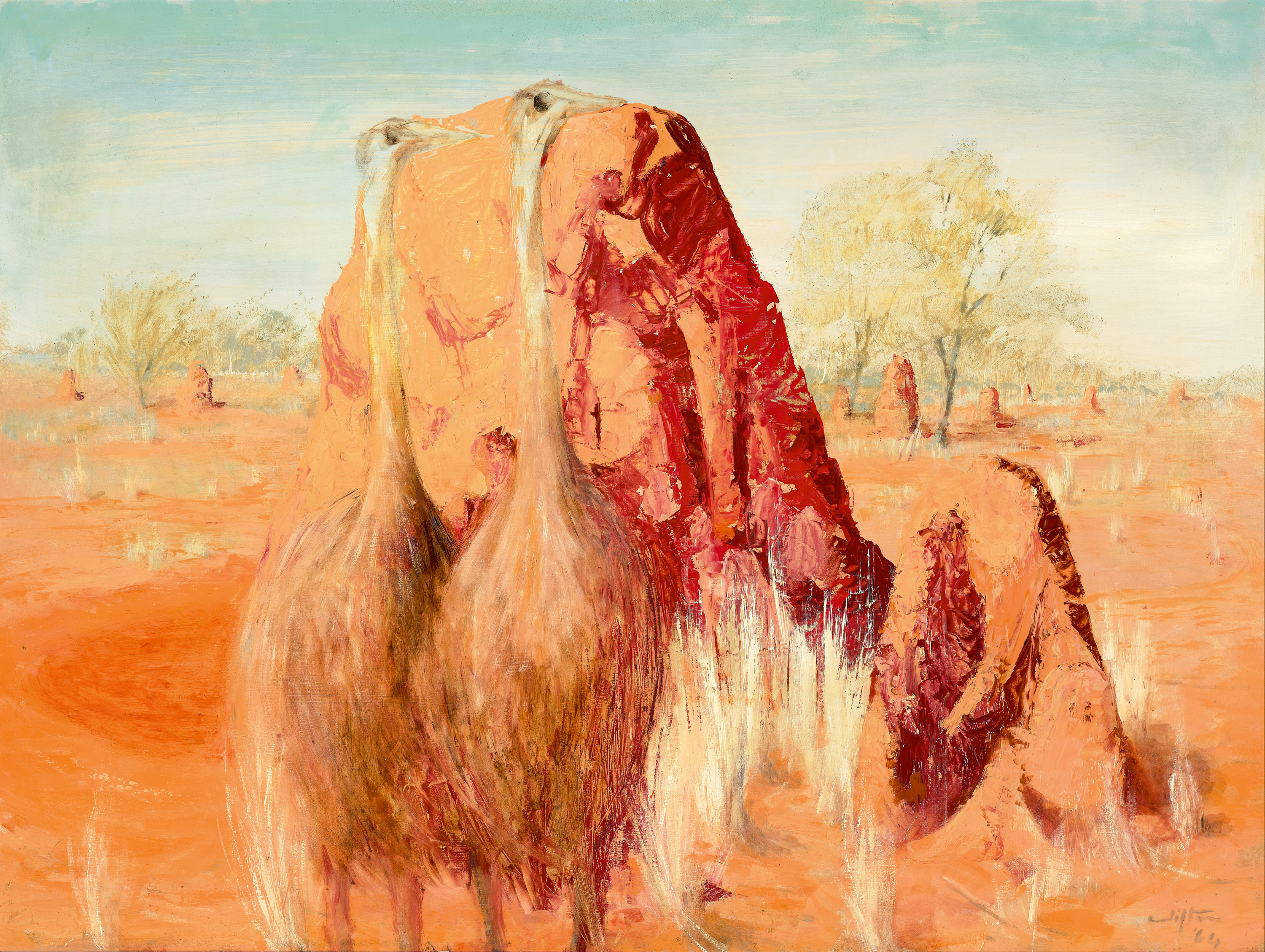 Pugh's landscapes have a structural unity that ties the various elements together. There is a harmony between the subject and the ground, something that he also used to great effect in his portraits. In Emus and Anthills, 1964 the forms of the emus meld with the anthills, their shapes echoing one another. The landscape is ancient and dry. A few straggly trees provide some shade and the termites that created the anthills will provide food as a last resort, if the emus get desperate. Here depicted here as survivors shaped by millennia, these land-bound, nomadic birds are proud, wary, knowledgeable – and equipped to thrive in this harshest of environments.