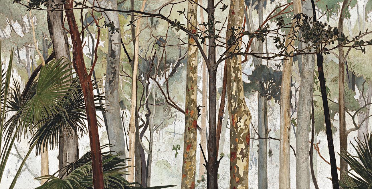 Drawn from life, Eucalypt Forest is the crown jewel in a suite of works created from the view of the sub-tropical bush around the Stella James House in Avalon, on Sydney’s Northern beaches. The artist and her husband, Peter Crayford, lived in this heritage-listed Walter Burley Griffin house over the summer of 1999-2000, and its vast surrounding area of pristine open native forest appears in several woodblocks and prints of these years, often featuring a combination of Pittwater’s distinctive eucalypts and Cabbage Palms. Tightly cropped and framed in the lower corners by fanned palm leaves, the composition of Eucalypt Forest is dominated by the strong vertical lines of the trunks of these gum trees, which tower way beyond the limits of our vision. In the foreground, an elegant sapling stretches its spindly branches across the width of the plywood block, welcoming the viewer into the composition and drawing the eye delicately throughout its dense bush, amongst the trunks, leaves and into the shifting mist beyond.