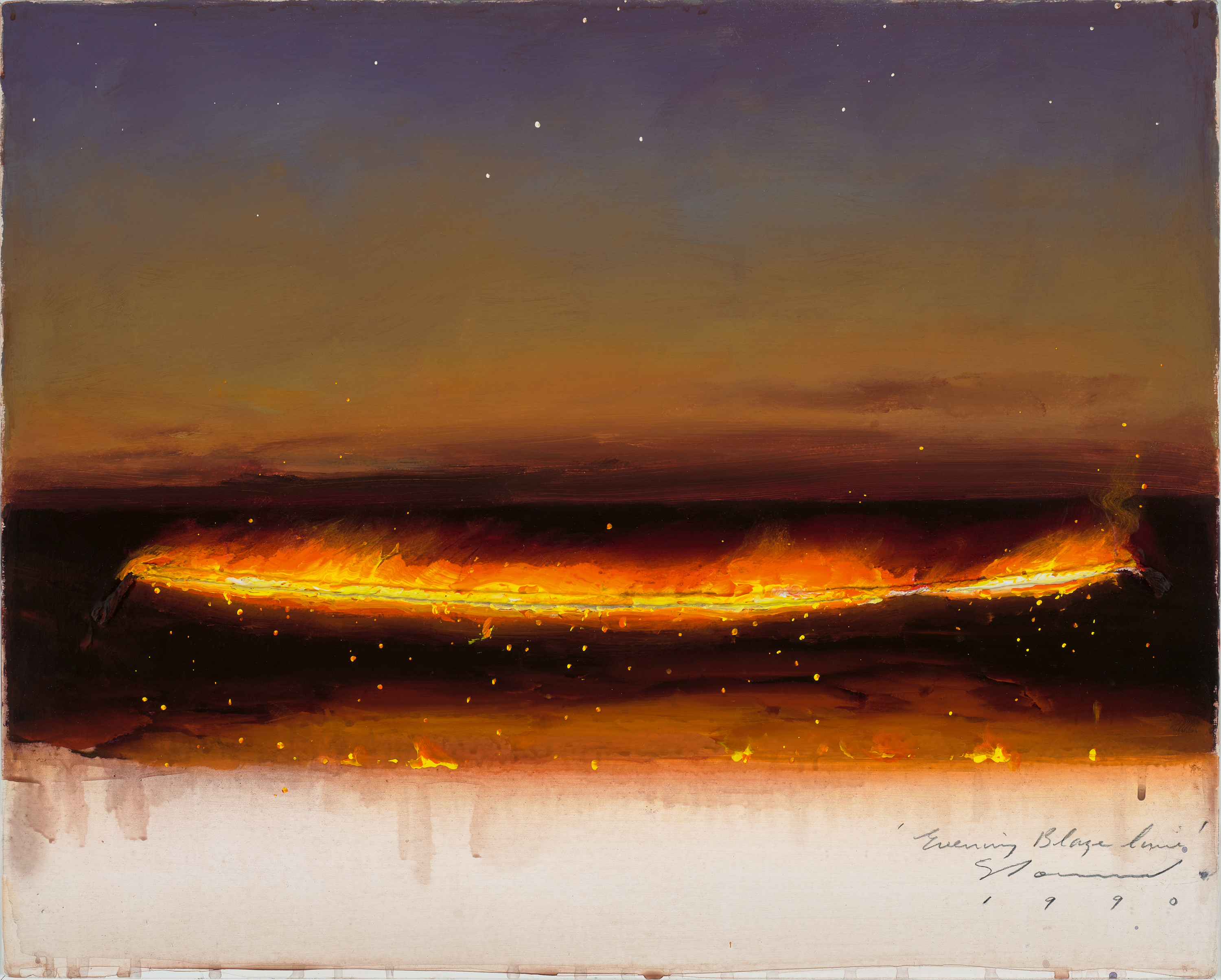 signed, dated and inscribed with title lower right: ’Evening Blaze line’/ Storrier / 1990