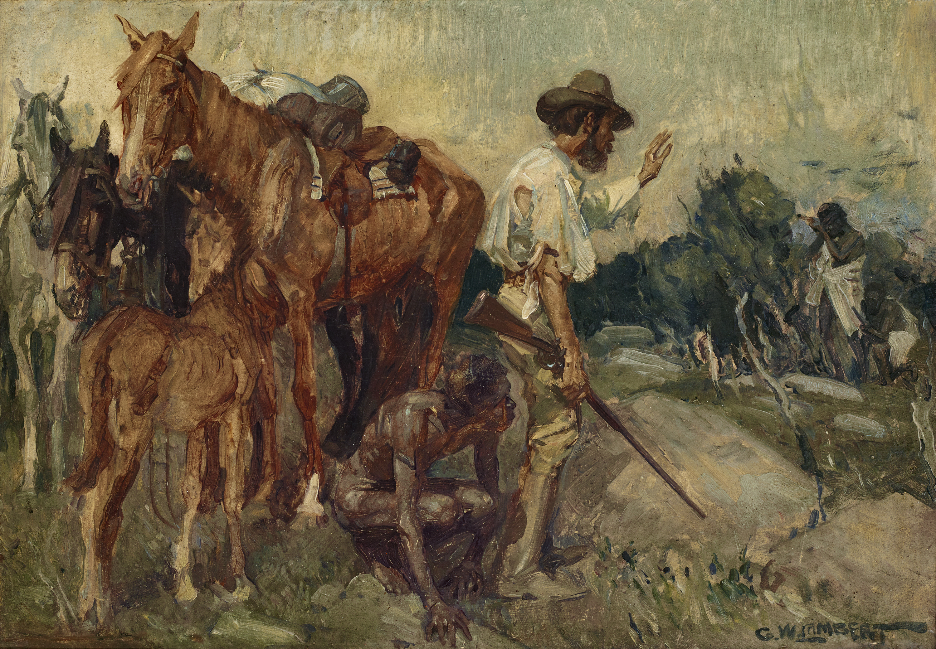 When commissioned to work with Lang, the artist was already noted for his illustrations for The Bulletin from 1895, and for similar work in three books published by Angus and Robertson. After re-locating to London in 1902, he continued the practice with Cassell’s and Pall Mall magazines, and the following year, drew lively sketches for Alexander Wilberforce (A. W.) Jose’s Two awheel: and some others afoot in Australia. However, Jose’s writing suffered next to Lambert’s contributions with The Bulletin for one proclaiming that ‘the illustrations are more interesting than the book.’1 In 1907, he was invited to create twelve images to accompany the text in Romance of Empire: Australia, one in a new series of books exploring outposts of the British Commonwealth; other countries included Canada, India, West Africa, New Zealand and South Africa. Lambert’s illustrations were originally executed in watercolour and he chose to subsequently reproduce a small number of these of these in oils, including the lot on offer here.