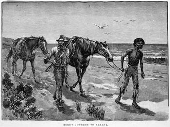 The description of Eyre and Wylie’s journey covers three chapters in Romance of Empire: Australia and was informed by the author reading Eyre’s own account, published in 1845, and Professor J.W. Gregory’s The dead heart of Australia: a journey around Lake Eyre in the summer of 1901-1902, which appeared in 1906.2 In 1840, Eyre was still only twenty-five, yet had already gained notable attention for his entrepreneurship in driving stock from Sydney to South Australia, plus a sequence of explorations to the north of Adelaide. In January 1841, he commenced the attempt to cross the Nullarbor, and after a few stalled beginnings, Eyre sent most of the party back once they reached the head of the Great Australian Bight. His remaining companions were the overseer John Baxter; Wylie, a sixteen year-old Noongar man from the King George Sound district; and two younger boys, Neramberein and Cootachah, recorded as being from the Flinders Ranges.3