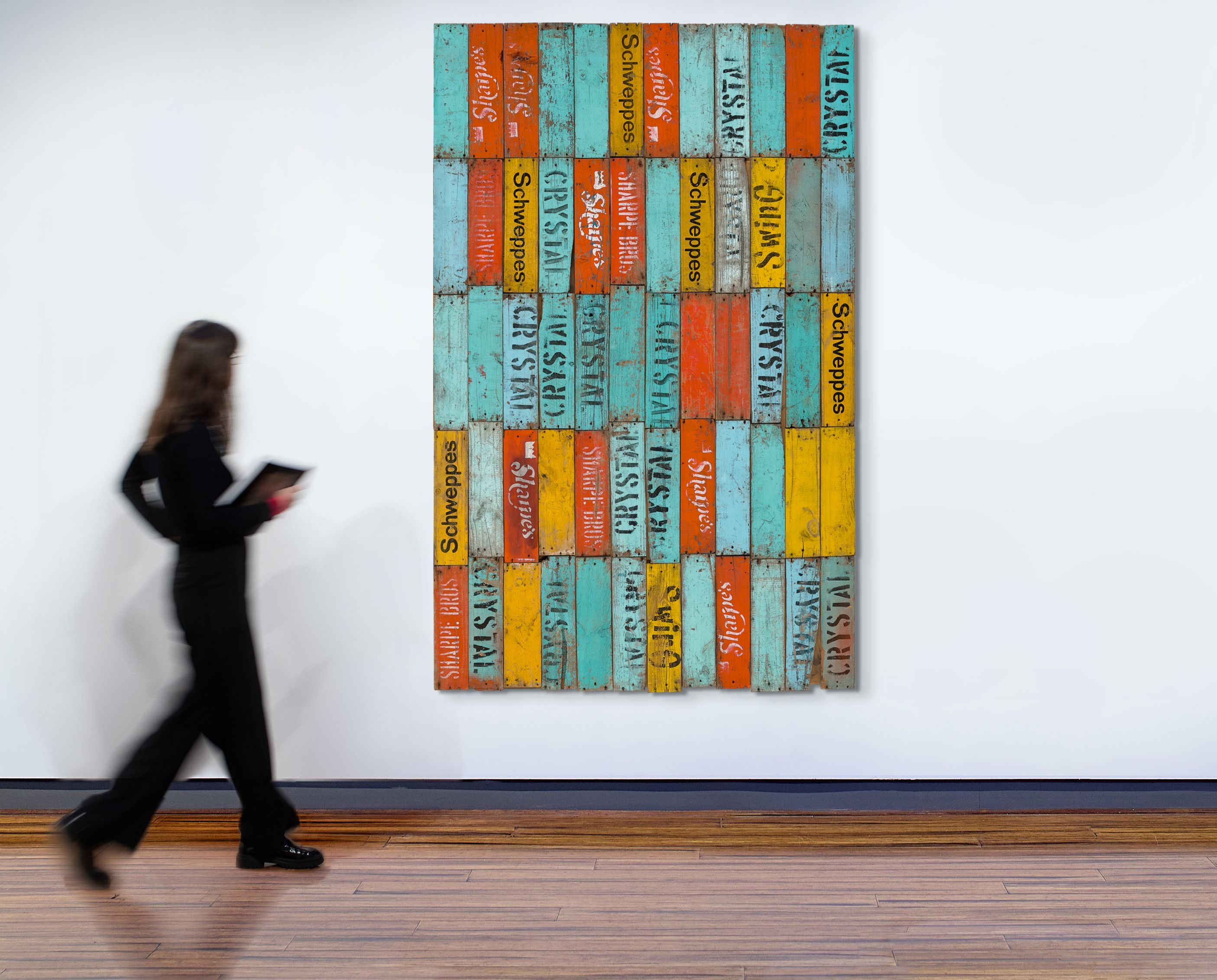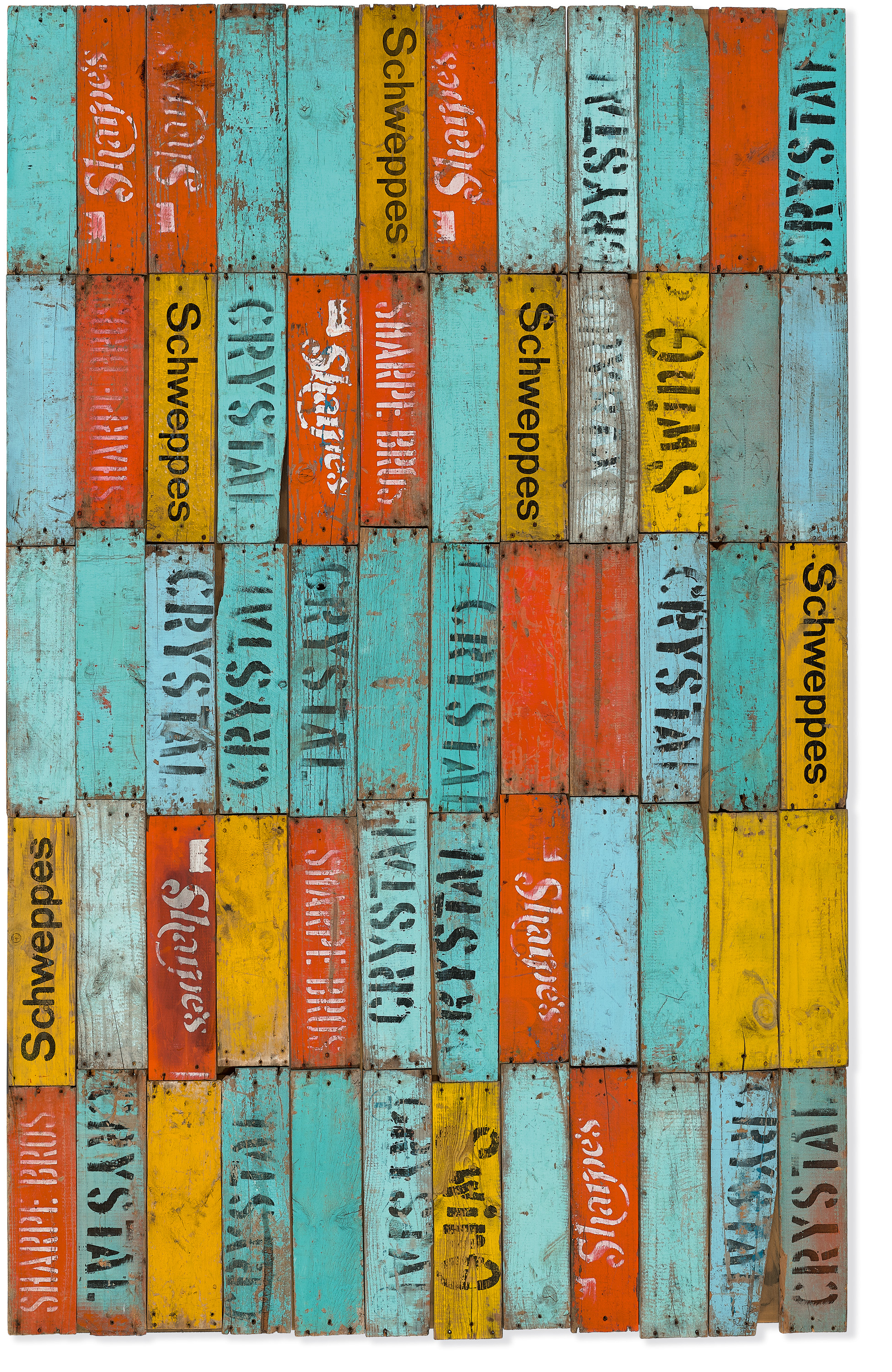 Using these materials was a time-consuming and labour-intensive exercise, with each horde having to be sorted, stacked, cleaned and dismantled – including pulling out up to forty nails from each box – before the process of beginning the work could even commence.6 The Fall, 1981 dates from a period in which Gascoigne primarily (but not exclusively) used the whole boards of the crates, arranging them in some of the largest and most ambitious works she made with this material. The palette of the crates of the different companies – Crystal, Sharpe’s, Swing and Schweppes – is used to great effect, creating a sense of dappled colour and movement across the work as the typography of the various logos jostle and shimmer; their vertical arrangement creating a sense of the planks falling, like autumn leaves, from the top to the bottom of the composition. Together, the gentle movement of the work’s component parts in concert with its title, powerfully evoke the inevitability of time passing, and of seasonal change.