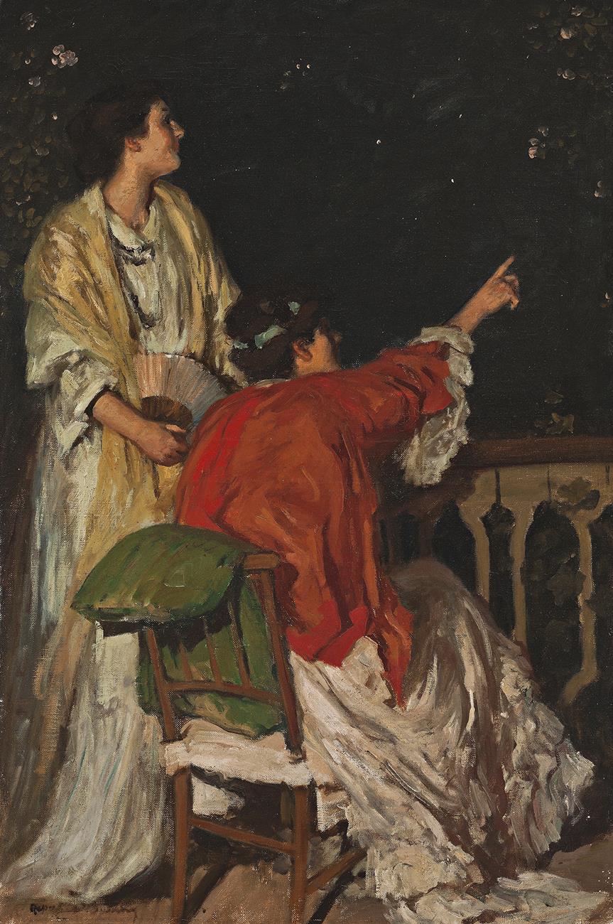 While narrative in Bunny’s paintings is reserved for the senses, their enveloping presence in his art is part of its magic. Delight in the caress of light on flouncy dresses, the feel of silk, intimate conversation, the indulgent warmth of a summer night in August. Others in this series evoke music by title, colour and composition as in The Song in the Distance, c.1909 (Queensland Art Gallery, Brisbane) and A Nocturne of Chopin, c.1908/9 (National Gallery of Australia, Canberra). The Falling Star adds another element – excitement. The two women, one seen from behind, the other a side view, strike an informal note, composed to invite the viewer’s participation. Contrasted against the pulsating darkness of the summer evening, you can almost feel the warmth of the night air. Yet, like the falling star, all is transient. The falling star has long been a token of good luck – and seemingly lots of other things. The wish you make might come true. Bunny’s favourite model, his beautiful wife Jeanne, attracts attention by her action and the focus on his favoured colours of red and green. When shown in Bunny’s 1911 exhibitions in Melbourne and Sydney, The Falling Star was singled out for mentioned by the critics.5 The writer for The V.A.S. asked enticingly, ‘ … is it a little like Paul Veronese?’.6