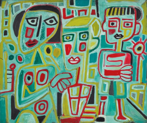 The shadow of Picasso certainly looms large in the assured brushstrokes and blocky shapes of Family Group, with the work’s high-keyed palette of yellow, red, blue and black transforming a warm domestic scene into a study of pattern and colour that begins to dissolve the outline of the work’s three figures.