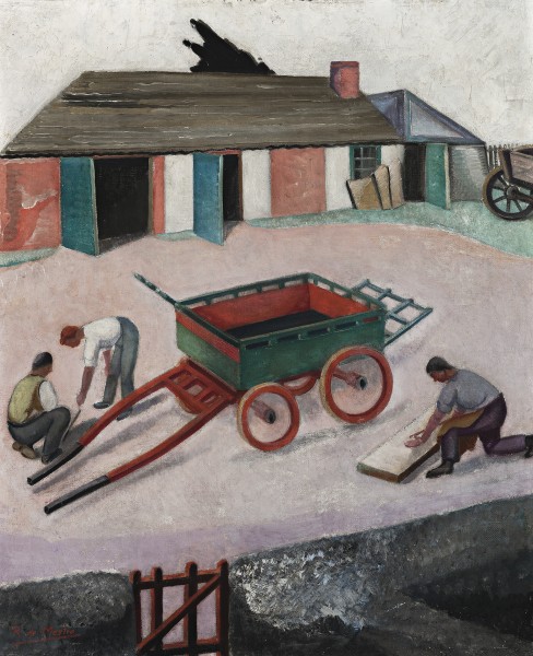 The first owner of The Farm Cart was most likely Lady Enid de Chair, an avid patron of modern art and wife of the then Governor of New South Wales whose vice-regal summer residence was close to the artist’s family home in Moss Vale. De Maistre entered a portrait of the Governor in the 1929 Archibald Prize and they stayed in contact after he returned to England in 1930 where the de Chairs subsequently commissioned him to paint a series of mural panels for their London apartment. Whilst there are small conflicting details regarding the painting’s date,5 it has the tenor of an English or French subject, an argument supported by the inclusion by De Maistre of a Dorset landscape (Bridport Harbour) in the South Kensington show and the existence of three French paintings dated 1930 which were included in his major Retrospective at the Whitechapel Gallery, London, in 1960.6 Although The Farm Cart was not included in this later exhibition, a reproduction of it featured prominently in that catalogue indicating this painting’s continued significance for both the artist and the exhibition’s curator.