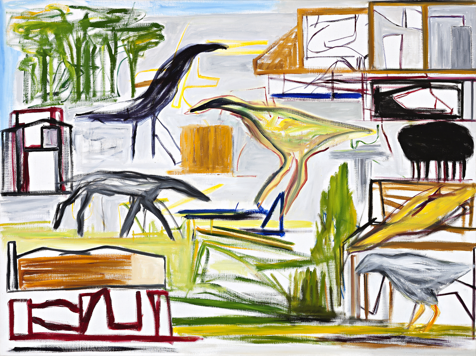 Farmyard with White Livorno, 2001 – 2002 is typical of Whisson’s most characteristic works. It draws on the artist’s stored repertoire of memories and is created in his usual manner of reworking the picture over two or more painting sessions, maybe months apart, thus the various dates inscribed verso. The picture is just as likely to be a record of a conversation about a place, as much as it may be a visual depiction. The White Livorno in the title refers to the form to the lower right which is a Leghorn chicken, Livorno being the Italian name for the Leghorn.