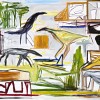 Whisson traps pockets of the thought process and uses these to distil layers of complex visual memories into essential triggers for memory. His bright secondary colour is most important as he uses it to present the forms in a layered, matter of fact and almost simplistic manner. His basic colour combinations are not dissimilar to those of a sign writer and he uses these with similar intent, to convey ideas in a way which arrest your attention, and lead your eye through the narrative in an almost subliminal manner.