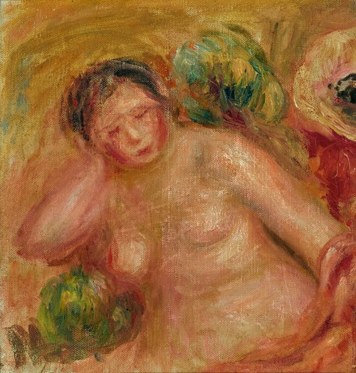 The female nude in a landscape was a continuous, compelling subject for Renoir and he returned to to the theme in several small canvases made during these last years of his life. In Femme nue assise, Dédée sits in an indeterminate space surrounded by fragments of vegetation and flowers, the whole scene rendered in vigorous brushwork and colour. Renoir sought to depict her as ‘simply one with the landscape ... (but) the most important thing is for it to remain (a) painting.’5 In this regard, the artist’s technique remains visible in Femme nue Assise. After first sketching in the image, Renoir applied layers of thinned turpentine with varying additions of white. ‘After a few more touches, one saw the beautiful round figures emerge from the coloured fog of the first stage of the picture.’6 Dédée, a similarly beautiful round figure, has thus been immersed within her environment by these means, her eyes closed in repose, her body rich with life, all imbued with Renoir’s painterly vision.