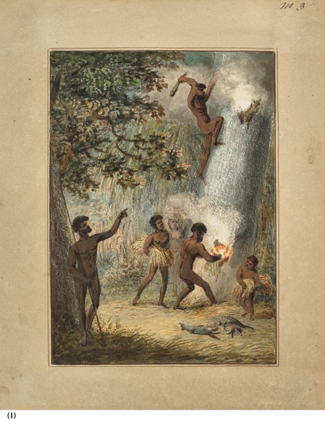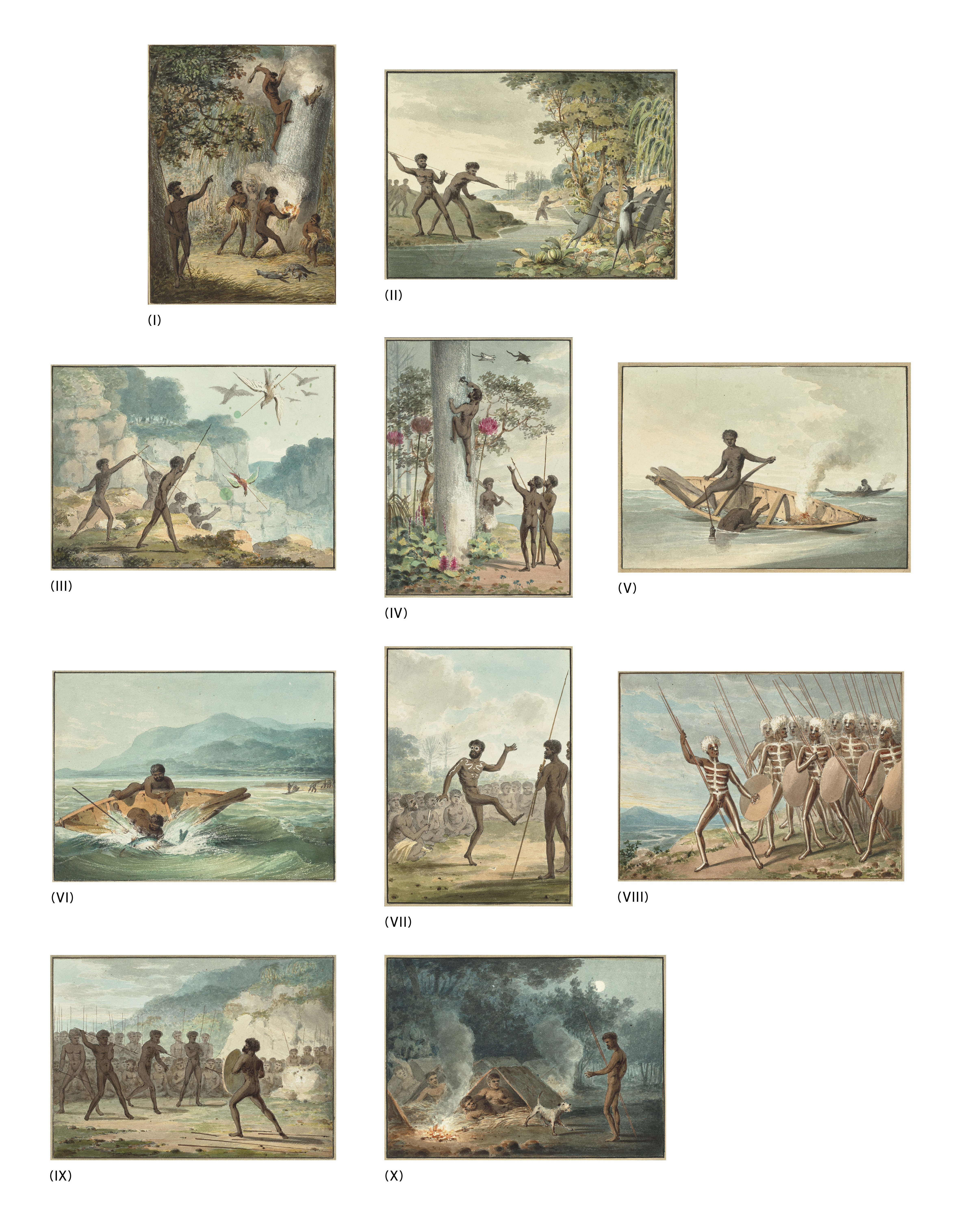 In 1813 a remarkable book of hand-coloured aquatints with accompanying text was produced in London. Titled Field Sports &c. &c. of the Native Inhabitants of New South Wales, it comprised ten scenes of Aboriginal Australians participating in a range of daily activities including hunting various animals, fishing and resting, as well as ceremonial scenes of dancing, ritual trial and preparation for battle. Published twenty-five years after the foundation of Sydney, it was the first book dedicated to this subject. These ten watercolours, in beautifully fresh condition, are integral to the production and promotion of this important volume, and thus to the European/settler visual representation of Australia’s First Peoples.