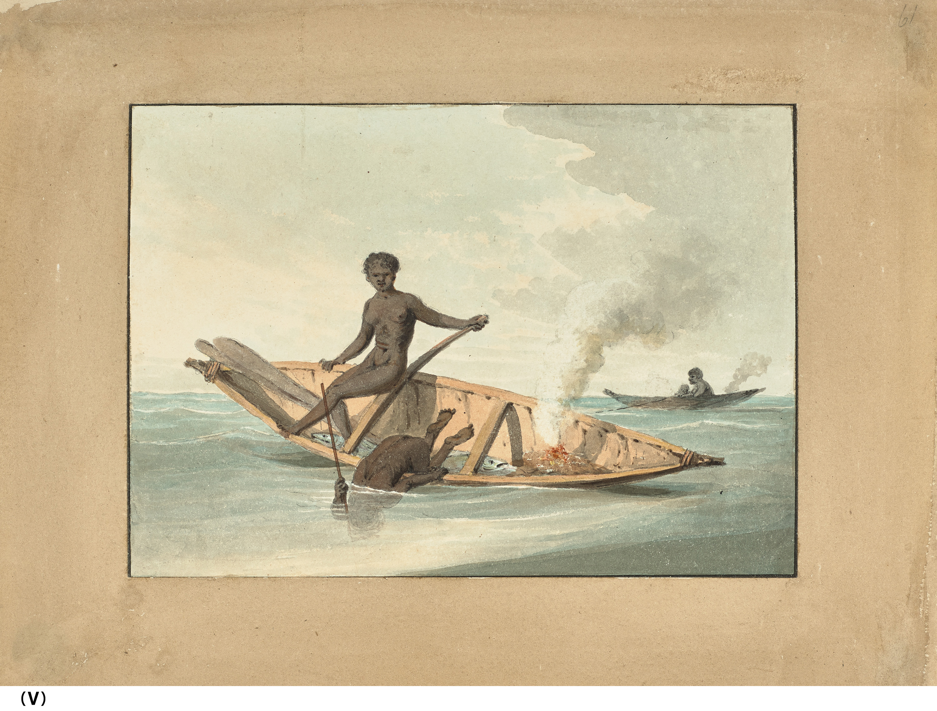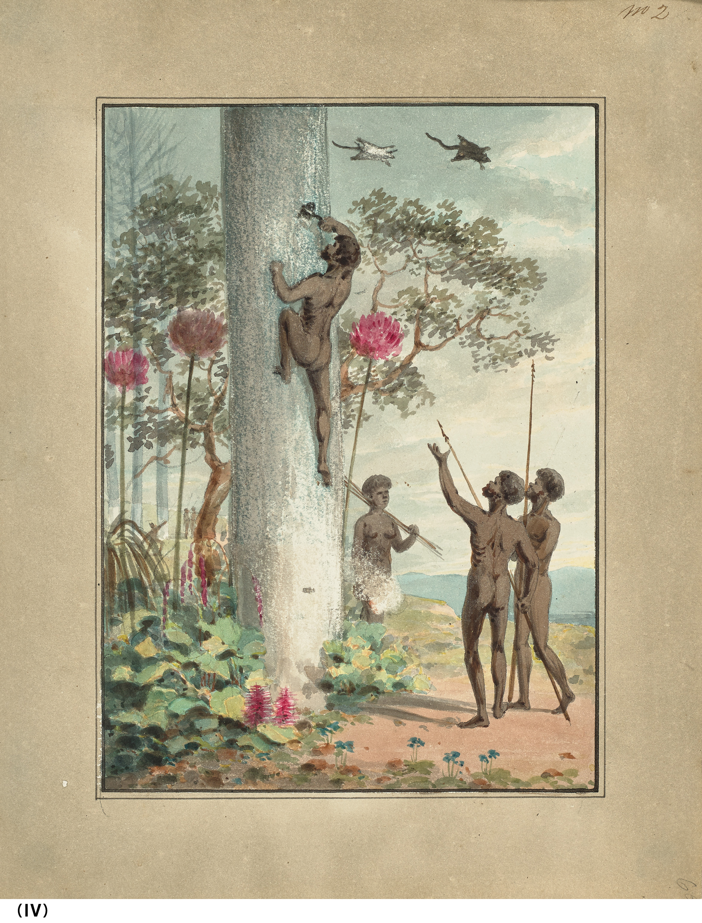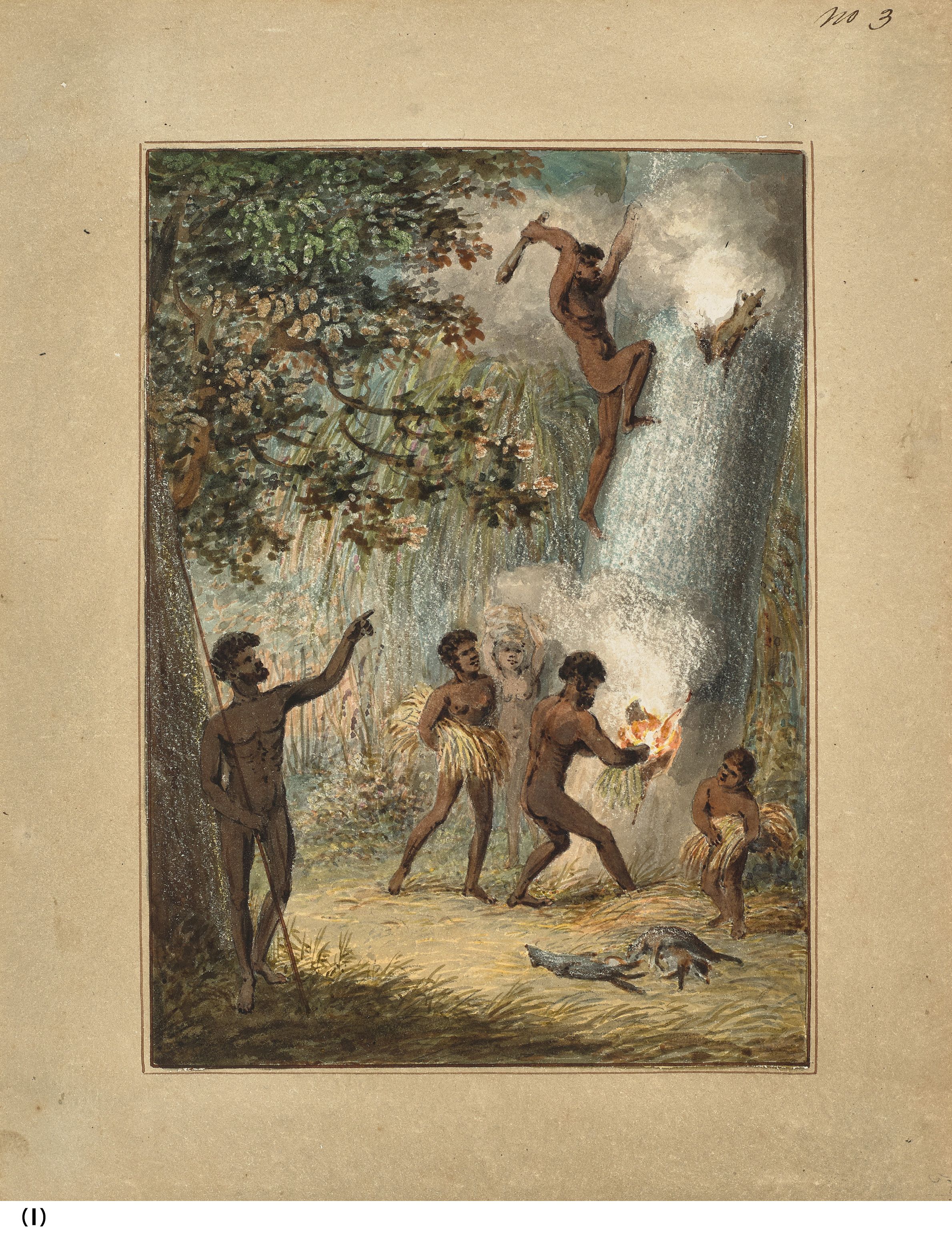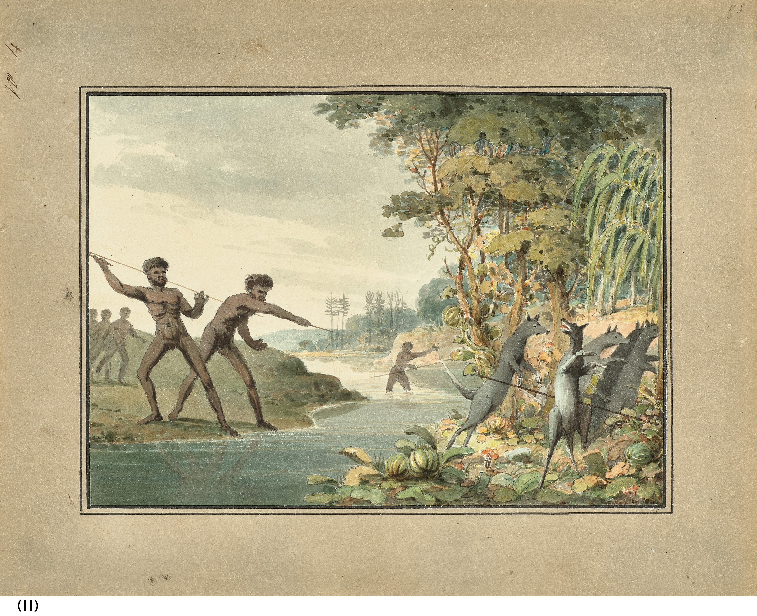 If these images were creatively compiled by Clark from textual sources, many anomalous details are explained, such as the round shields of the warriors who are painted identically ‘like so many moving skeletons’, and kangaroos like greyhounds on their hind legs (despite being on display in London menageries since the 1790s).5 At the same time, each of the scenes is clearly recognisable, showing Indigenous methods of climbing trees or smoking out prey, and details such as the use of the woomera, to further propel the spear, are accurately depicted, just as described.6
