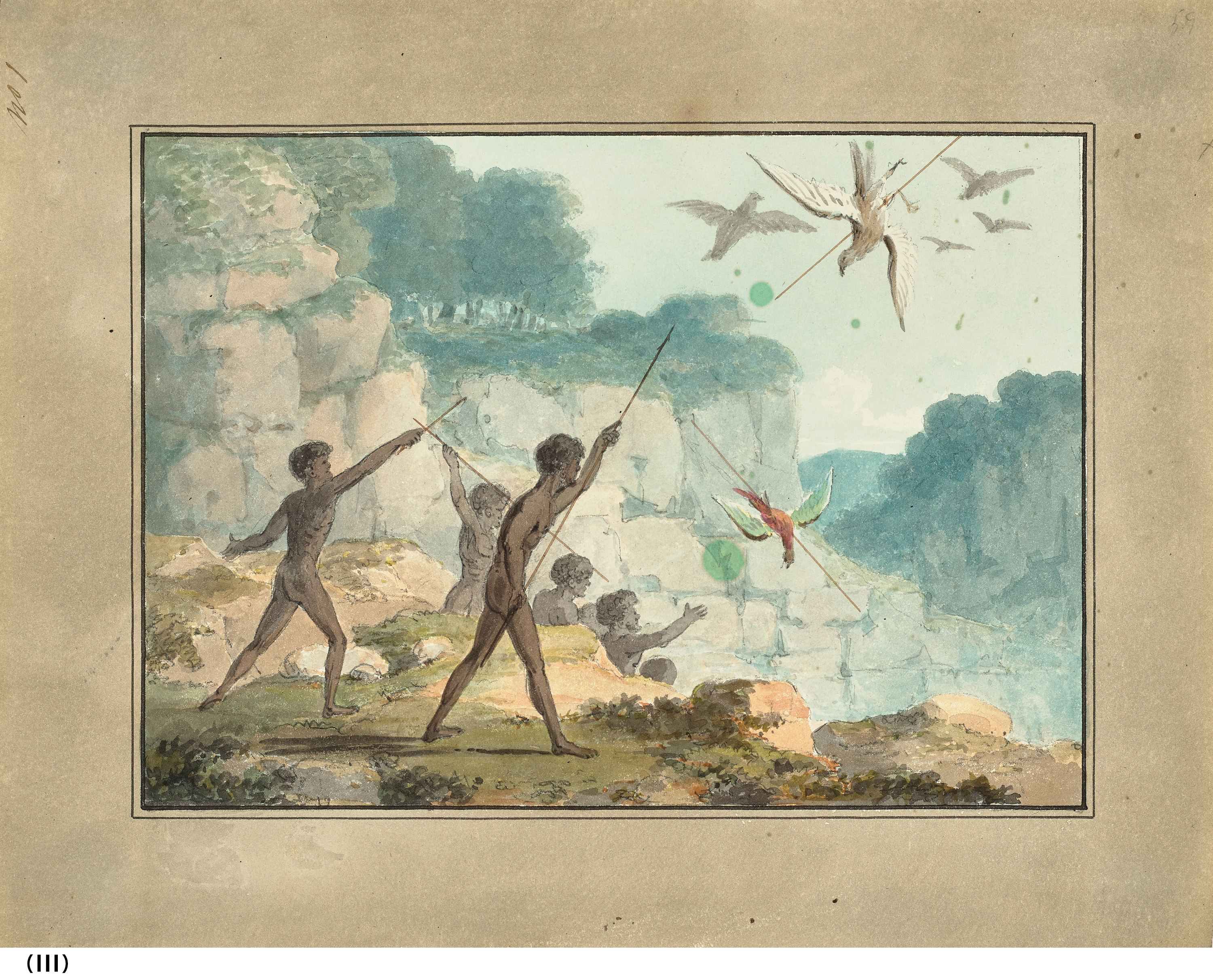 This description is perfectly captured in Throwing the spear, yet the birds bear no similarity to Australian birds. Similarly the vegetation throughout the series is unrecognisable as native, yet that seen in Hunting the kangaroo tallies with Mann’s odd description of pines being scarce, but melons ‘large and plentiful’. A noticeable absence in these views is the distinctive grass tree (xanthorrhoea), which was regularly included in early art as a symbol of the Australian landscape.