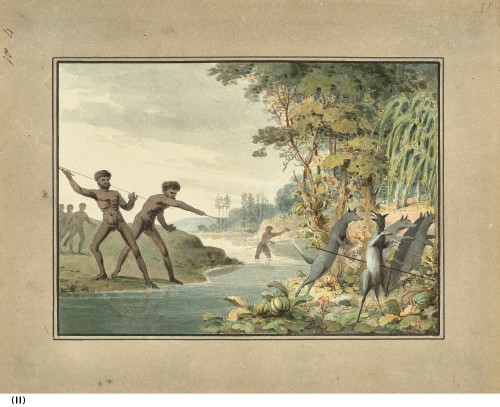 This series then provides a fascinating insight into the way that Europeans were interpreting and visualising information being received from the distant colony of New South Wales. How do you envisage a Gymea lily if told of a giant pink flower on a single stem towering overhead? How do Aboriginal people dance? Furthermore it presented British and other readers with a view of communities, their food sources and their Country untouched by invasion, with no sign of their drastically changed world: 1813 was the year that British first crossed the Blue Mountains. Women’s primary role in fishing and food gathering is also overlooked in the images, although their skill was praised in the accompanying text. The exotic appeal of the series is confirmed by a reissuing of the Foreign Field Sports in 1819 and again in the mid 1820s, with a number of plates copied for a children’s book published in Paris in 1830, thus having a continuing influence on European perceptions of Australia in the nineteenth century.8