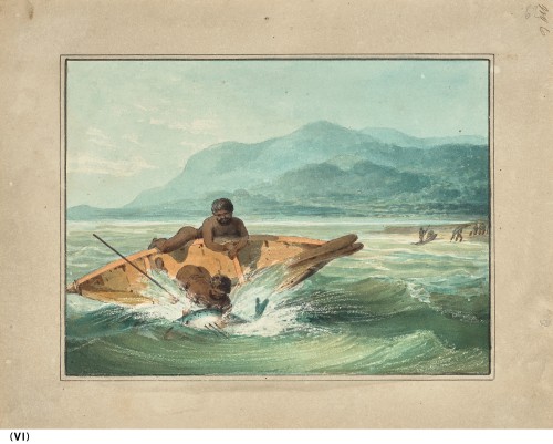 Most importantly these watercolours are captivating images, painted by a skilled artist who exhibited regularly at the Royal Academy throughout his long and productive career. Clark was also a teacher, author of A Practical Essay on the Art of Colouring and Painting Landscapes in Water Colours (1807) and A Practical Illustration of Gilpin's Day Representing the Various Effects on Landscape Scenery from Morning till Night, In Thirty Designs from Nature (1811), in which he demonstrated how to depict temporal and atmospheric effects. These glowing watercolours show Clark’s accomplished use of the medium, as in the energetic scratching back to capture the splashes of the speared fish in Fishing (No. 2). Slight differences, such as distant figures in Climbing trees or the spears in Warriors raise questions as to whether these were the source from which Dubourg etched the plates, or created as a unique set painted either for an individual or to promote the prints – either way, they are intrinsically connected with one of the earliest illustrated publications about Australia. That this set has remained in such superb condition and complete since 1813 is remarkable.