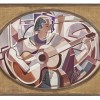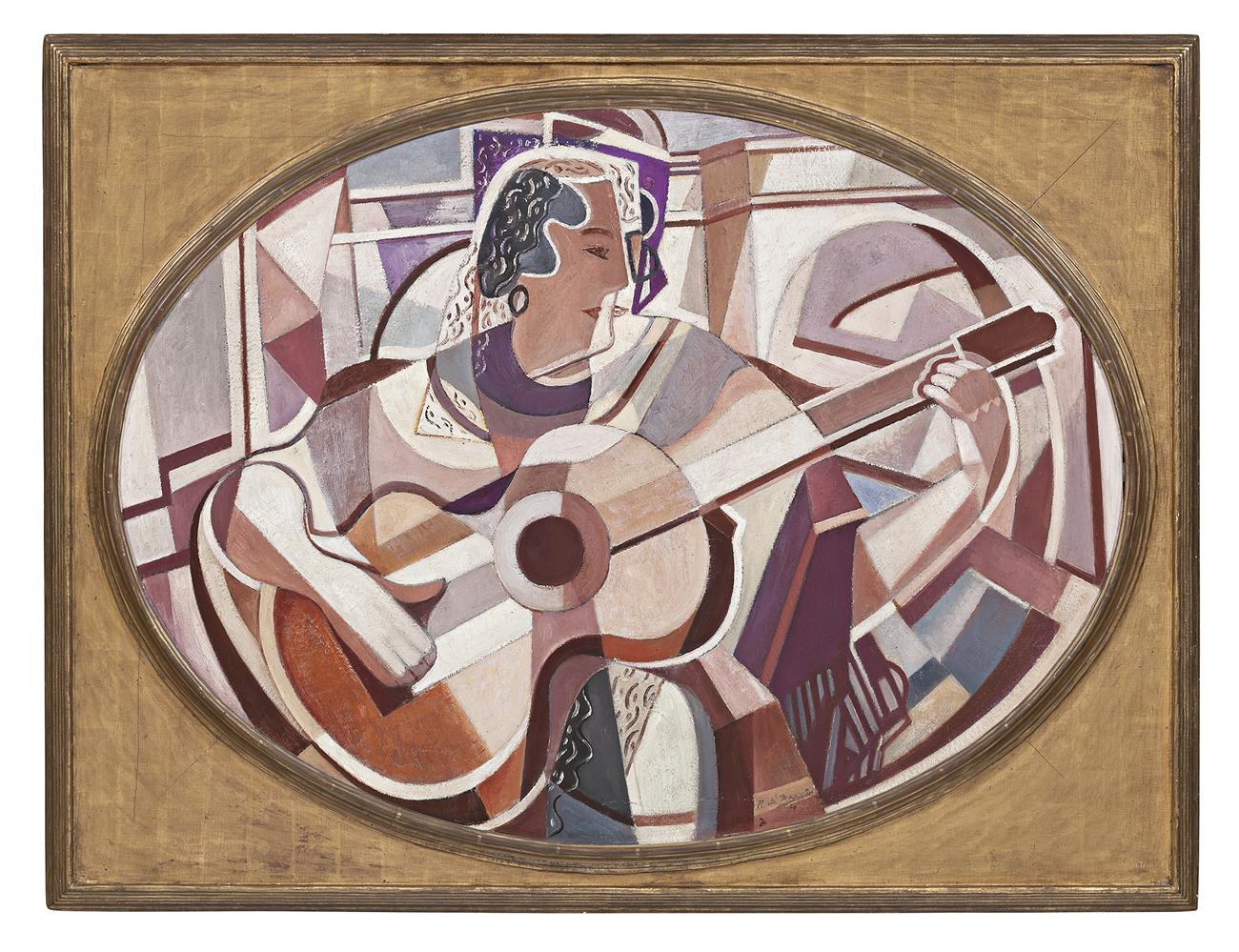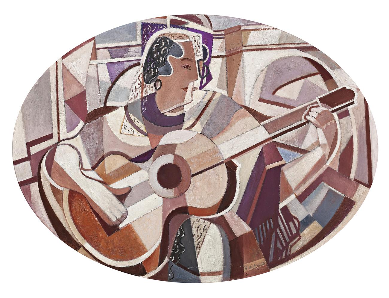 Figure with Guitar, c.1932 – 35, is a major early example of Roy de Maistre’s fascination with Cubism. Its large ovato tondo shape is unique in his oeuvre and features as its subject a female guitarist that the artist had first sketched ‘in front of the bridge in Toledo’,1 seen looming behind her. De Maistre had already painted two realist studies of the Alcántara Bridge, an arched stone construction dating from the Roman Empire (see lot 5) but in Figure with Guitar, the location is of little importance. Instead, de Maistre uses the motif as the basis for a complex examination of artistic possibility within design and composition, features which mark the majority of his paintings done in Europe following his relocation to London in 1930.