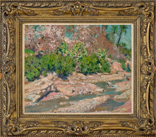 In the years prior to 1913, Fox had already established himself as one of this country’s leading artists, having studied at the National Gallery School in Melbourne, then in Paris in the company of Tudor St George Tucker. On their return in 1893, the two men opened the Melbourne Art School, famed for being the most progressive in its day. In subsequent years, Fox was the first Australian to be elected into membership of the Société Nationale des Beaux-Arts, Paris, and the International Society of Painters, Sculptors and Gravers in London, but what is less known is his impact on this country’s earliest modernists. Roland Wakelin would later recall of Fox’s exhibition in Sydney in 1913: ‘We’d never seen colour like that before… this was expression through colour.’3 With a provenance that includes Joseph Brown, Sir Leon and Lady Trout, and the Krongold family, Figures beside the creek, Stanwell Park is a superb example of Fox’s mature painterly technique.
