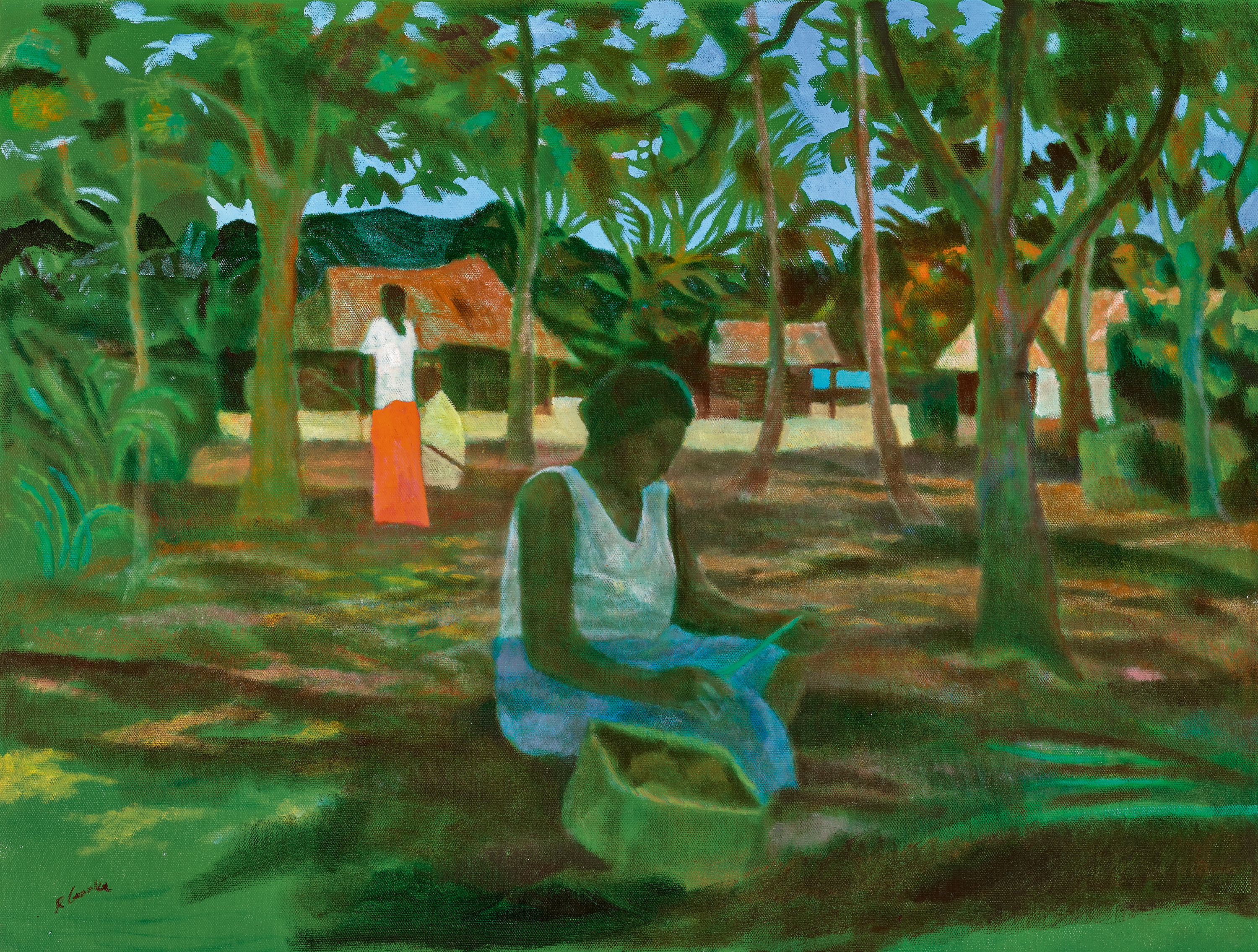 Drawing inspiration from a lifetime of experience living in Northern Queensland and the adjacent Melanesian islands, Ray Crooke is celebrated for his quiet but intensely evocative landscapes which emphasise the monumental simplicity and laconic grace of people shaped by their environment. Whether engrossed in daily rituals, glimpsed in the cool of shaded rooms or ensnared within webs of light and shade beneath jungle vegetation, his compositions bear a strong sense of locality, describing with unprecedented accuracy this remote region and the unique light that so distinguishes it. Yet while his finished compositions such as the magnificent Fijian Village offered here appear as ‘snapshots’ or portraits of specific places, they are nevertheless ‘the remembrance of things past’, emerging from his mind’s eye following the disciplined distillation of observed fact previously explored through studies and sketches. Encapsulating the artist’s desire to create ‘a romantic form of expression based upon imagination and emotion’2, indeed such works give precedence to mood over action or narrative to examine, rather, the fundamental relationship between man and nature.