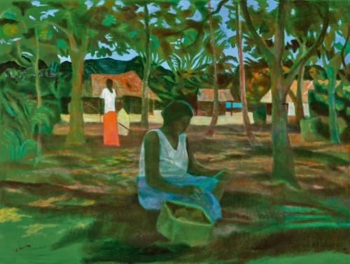 Fundamental to such conscious ordering of forms towards an aesthetic ideal is Crooke’s enduring preoccupation with tonal relationships, contours and silhouettes, and the dramatic juxtaposition of dark against light. Indeed, despite his richly decorative and highly developed sense of colour, one only need compare such tropical landscapes with those of his artistic predecessor, Paul Gauguin, to discern ‘the differences between an artist working through tone and one who worked through colour.’3 Underpinning the strength and authenticity of his vision, thus the image here is built up from a dark ground organised around tonal relationships to reveal a carefully constructed scene, punctuated by the sudden intrusion of brilliant light. Imbuing the work with a powerful sense of mystery and curious timelessness, it is this sensation of clear defining light which gives stature to the islander women and reveals Crooke’s abiding interest in the dignity of man. Betraying strong affinities with the art of Florentine Renaissance masters Giotto and Piero della Francesca in their quest to locate the eternal in the present moment – that point of intersection between time past and time to come – Crooke’s meditations accordingly invite his audience to experience the art of stillness, to appreciate the flow of time in its purest, most metaphysical sense. For, as James Gleeson astutely asserts, that ‘special kind of magic’ in Crooke’s paintings ‘only begins to work when one has discovered the stillness and the silence that lies at the heart of everything he paints... This stillness is not the mere stillness of arrested motion, but the projection of a mind preoccupied with deep and permanent things.’4