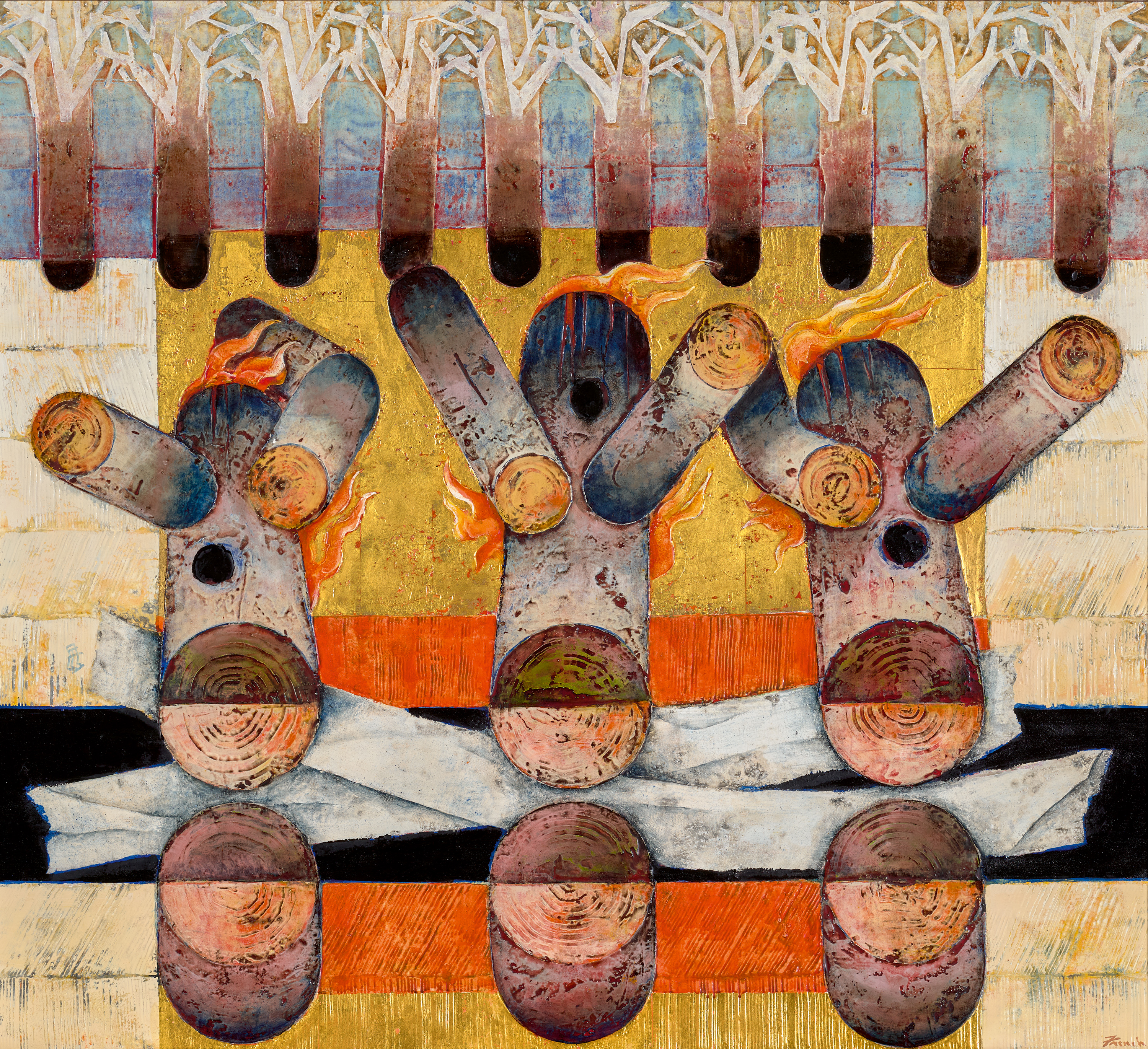 Having thus forged his own path from relative obscurity to astonishing popularity through his unique modernist style that encapsulated a deep humanism and spirituality – notwithstanding the dominant abstraction aesthetic of the time – during the 1970s French would delve more fully into the figurative idioms that today define his oeuvre. Between 1974 and 1978 in particular, he completed his ‘Fire and Rain’ series which, comprising fifteen works including the present, was exhibited to widespread acclaim in Sydney, Adelaide and Melbourne in 1978. Counterbalancing the dark allegories of death and captivity explored in his preceding series ‘Death of a Revolution’ created following the artist’s travels to South America earlier in the decade, such ‘Fire and Rain’ works were notably lighter in feeling and tone, although still employed a similar Christian-Byzantine symbolism to evoke connotations of war and social revolution. Accordingly, in Before the Fire, 1974 – 78, fire embodies for French a spiritual force, both capable of destroying corruption and encapsulating the vitality of the human spirit; the trees further reinforce this analogy, signifying the human figure, before subsequently evolving into cruciform motifs that allude to the three crosses of Golgotha, while rain, the second element in the series, here serves as a symbol of regeneration. As French reflects, ‘I set out with just trees and end up with crucifixes. There are several stages however, between the cosy arrangement of burning logs and the final crucifixion picture… the fire is a spiritual thing.’3