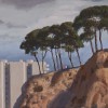 Creating a visual tension between the urban landscape and the natural environment, Jeffrey Smart illustrates the strength of modernity through the depiction of highways, road signs and imposing concrete buildings. The elevation of prosaic objects and structures into significant forms that attract and delight the eye is Smart's forte, as demonstrated in First Oil Study for Ring – a – Rosy, 1986. Against a brooding sky, a copse of pine trees line steep cliff faces that capture and reflect the sunlight. An apartment building – a beacon of urbanisation and a symbol of banal beauty – sits soberly in the background, demonstrating no sign of life within. The only suggestion of life is the small group of figures engaged in a lively game of Ring-a-Ring o’ Roses under the pine trees.