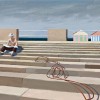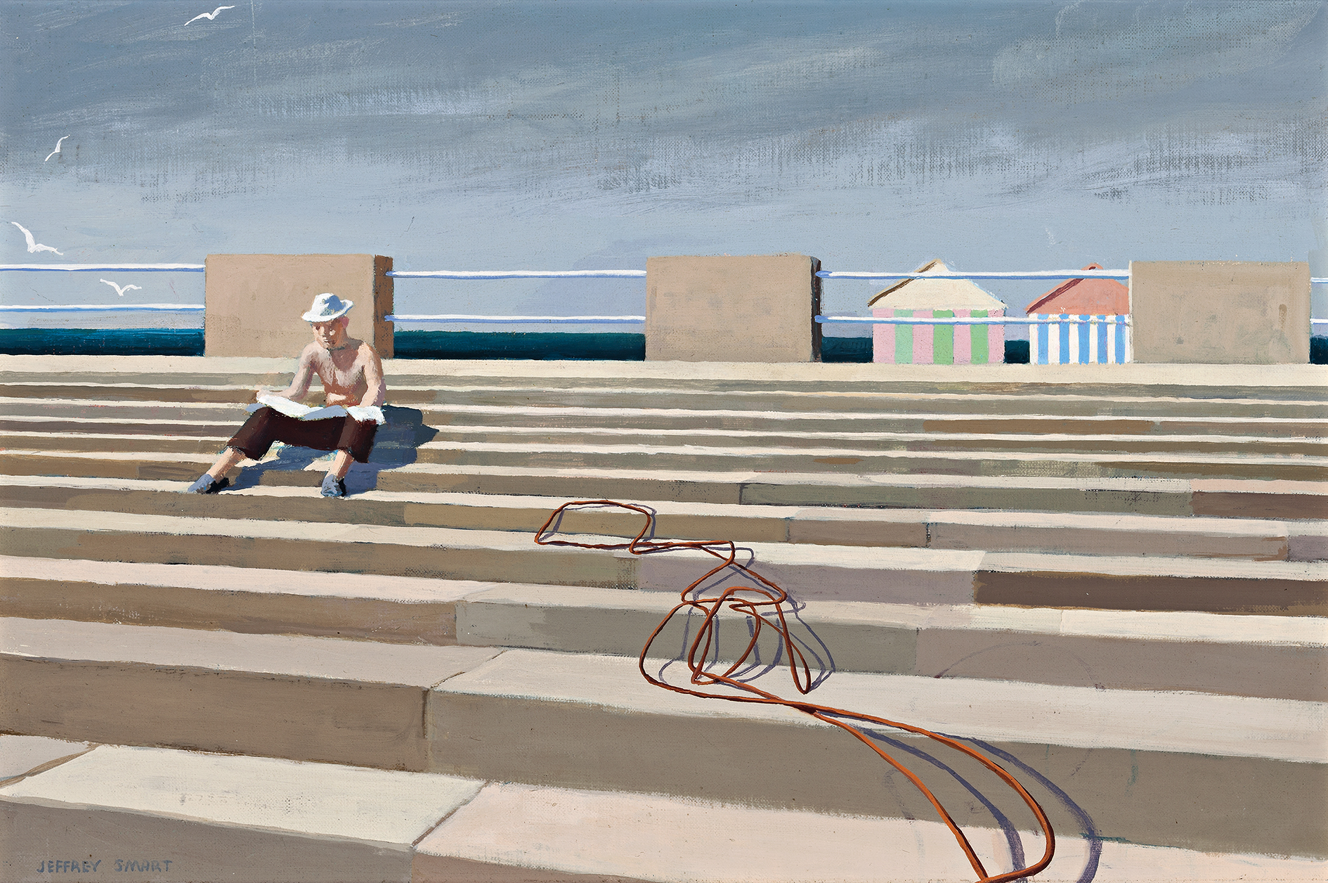 Smart’s move to Italy in 1965 introduced a range of unique subjects, particularly the new with the old, as in Ostia. Ostia Antica was the port city of ancient Rome, then at the mouth of the river Tiber. The nearby Ostia, founded in 1884, became a sea resort favoured by the Romans. Earlier, at E.U.R. (Esposizione Universale Roma), the very modern business and residential area in Rome, Smart had introduced the subject of a person, seated atop a long flight of stairs, reading. E.U.R. I, 1964 in the collection of the Newcastle Art Gallery, New South Wales, is a striking example. These Ostia and E.U.R. paintings share the same powerful visual rhetoric of steps ascending, smooth or textured of stone, revealing Smart’s love of geometric form echoed in buildings, lamps and railings – immediately contradicted by the snaking cable to tease the imagination. In each, the anonymity of the single figure provides an acute sense of isolation. 1