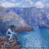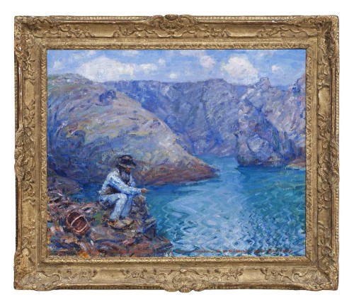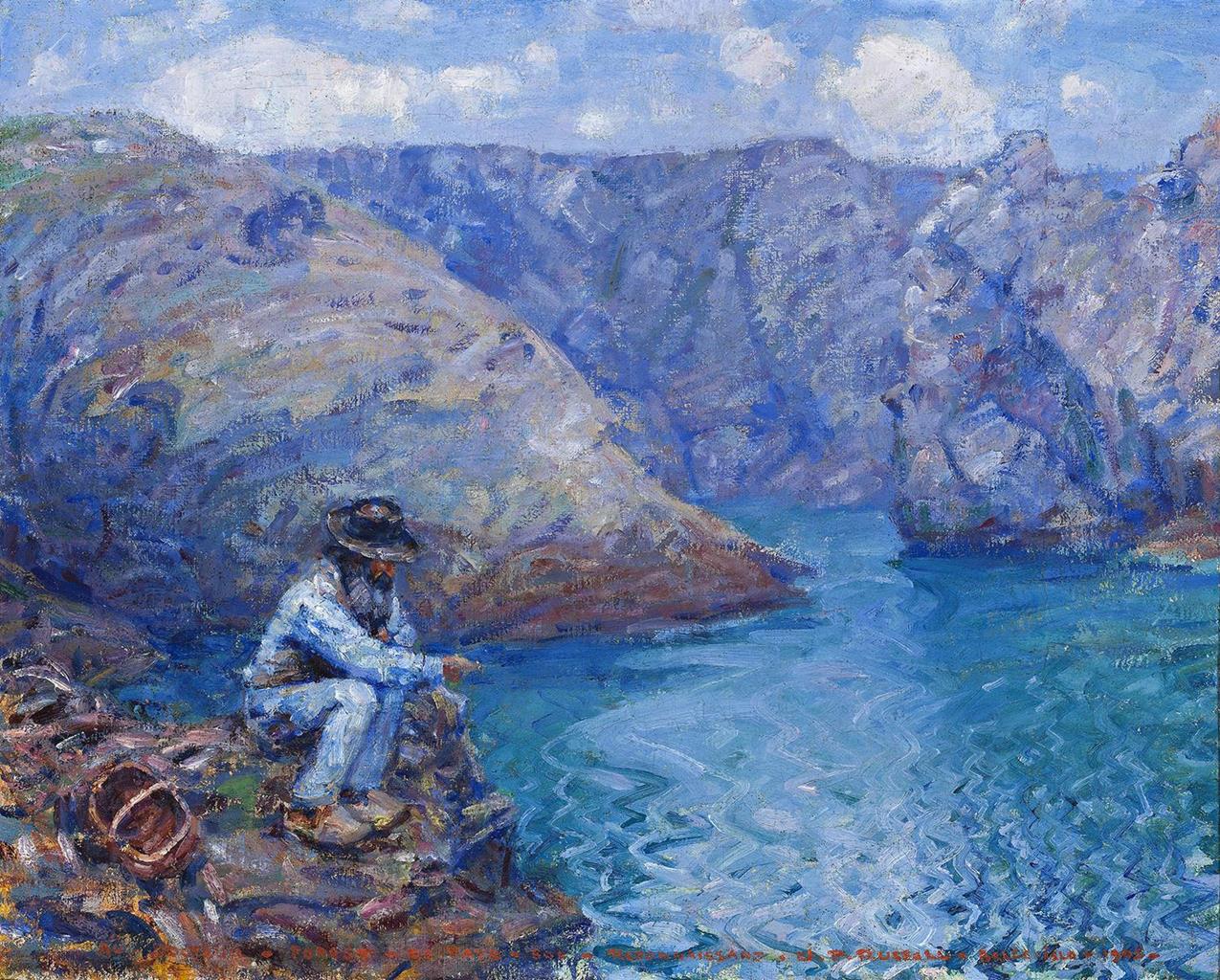 Russell employed Polyte as a gardener and handyman throughout the years he lived on Belle-Île and the two men must have developed an easy friendship, which is reflected in the various paintings in which the fisherman appears. Described as a ‘rustic, working-class old-salt’, Polyte also typified the kind of peasant subject in which Russell and van Gogh were interested, a man (or woman) intimately connected and attuned to the natural environment through their labours and representative of a way of life that was rapidly being lost in the wake of industrialisation. In Mon ami ‘Polite, 1900 (Art Gallery of New South Wales, Sydney), Russell depicts him walking along a cliff carrying a basket and axe, his weathered face framed by a hat and long white beard. The colours of his clothing merge with those of the surrounding sky and sea, and the entire scene is painted with uniformly expressive linear brushwork. The natural connection that exists between the landscape and Polyte is more prominent in Fisherman, Belle-Île (Pêcheur Belle- Île), where he is shown sitting on the top of a cliff, fishing in sheltered waters below. Rather than engaging directly with the viewer, Polyte appears focused on the task at hand, and once again, his clothing is painted in colours that mirror the blues and white of the sea and the sky. The image Russell presents us with in this painting is one of man at home in his surroundings, contemplative, peaceful and calm, a relationship that is perhaps just as pertinent to the artist himself as to his subject.