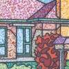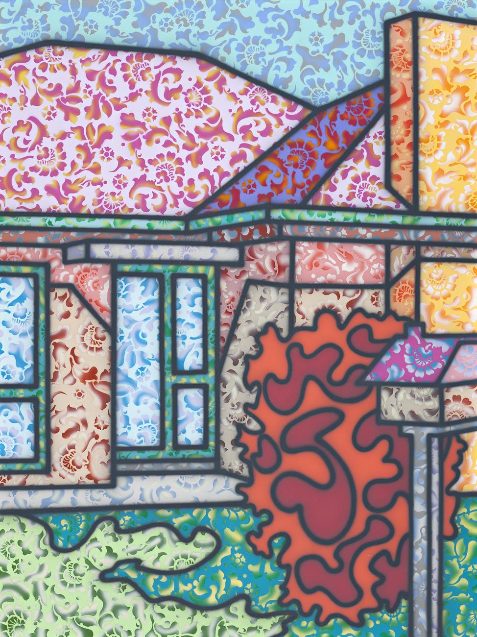 Painted in 1995, Floriated Address is part of a group of works in which Arkley’s use of decorative pattern and contrasting colour reaches a spectacular crescendo. Merging an aspect of domestic interior decoration with a view of the exterior, a stencilled ornamental pattern (borrowed from wallpaper and fabric designs) covers every element of the double-fronted house, as well as the lawn, low-lying plants to the left, and letterbox. Each area is demarcated by Arkley’s black airbrushed line and features variations of multiple colour combinations, the single element in the painting not decorated in this way, a tall orange bush behind the letterbox. The visual intensity of this painting and others, including Floral Exterior, 1996 (National Gallery of Australia), reveals Arkley in his element, balancing colour – sometimes jarring but always brilliant – pattern and detail within an image that is at once familiar, but in his hands, utterly transformed. The description of viewing the closely related work, Floriated Residence, 1994 (The Vizard Foundation Collection of the 90s, on loan to the University of Melbourne) as ‘something like a sensation of awe in the face of our ordinary domestic environment’ is equally pertinent here where, again, ‘the patterns heighten the mystery, like a series of lace veils, encouraging the fascinated eye to probe the subtle and exotic shifts of hue and curlicue, turning the humble house into a temple of ornamental intricacy and paradoxically fabulous craftsmanship’.10