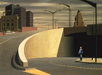 Laden with a sense of intrigue and the suggestion of action existing and persisting just beyond the audience’s line of sight, Smart’s paintings thus tantalise the viewer towards a source of meaning – enticing them to write their own screenplay, to imaginatively reconstruct the narrative which contains each scene. Despite his insistence to the contrary, such instinct is only heightened by the artist’s inclusion of figures that invariably appear isolated, solitary in spirit and place, and imbued with an air of stillness. Exemplified most poignantly by the mysterious, one-armed, bald and portly ‘everyman’ who stands marooned in the celebrated Cahill Expressway, 1962 (National Gallery of Victoria), Smart’s protagonists are emotionally remote, distanced and wholly unengaged with either their surrounds or us, the viewer – symbols, according to some commentators, of modern man’s loneliness and disillusionment. Seemingly oblivious of the viewer and unperturbed by the storm that threatens above, the waiting female figure in The Footbridge is similarly enigmatic, provoking mediation upon her circumstance and purpose: What is she contemplating? Is she waiting for someone? If so, for whom? And why in this location?