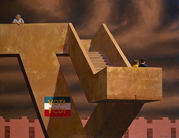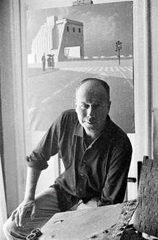 One of the great ironies of Jeffrey Smart’s immeasurable artistic legacy is that his works should evoke the classical stillness, geometry and light of Italian Renaissance painting, only to reveal simultaneously how that humanist adventure which began five centuries ago has led to an anonymous and inhuman contemporary environment.2 Invariably featuring isolated figures in modern ‘Orwellian’ cities, dwarfed by their own monumental creations, his compositions have perhaps not surprisingly invited comparison with both the haunted empty Italian piazze of pittura metafisica exponent, Giorgio de Chirico (1888 – 1978), and the lonely vistas of urban America depicted by Edward Hopper (1882 – 1967) whose art betrayed the melancholy belief that human beings and their values were being swallowed up by the rapacious advance of industrialisation. Yet to infer that Smart is somehow censorious or despairing of this urban landscape is misguided, notwithstanding the brooding unquiet skies, impersonal architecture and solitary figures that are the hallmarks of his art – as magnificently encapsulated here in The Footbridge, 1975. Rather his response is one of inexplicable supplication or gratitude for an often modest, slightly odd visual phenomenon in the contemporary world that has inspired him to spend time in the gloriously difficult process of constructing a painting.3 As Smart reflects, ‘When I am painting a beautiful object that has haunted me, I feel I’m doing no more than paying homage to it, in very much the same way as you Christians praise your Lord.’4 Redolent with his love of ambiguity and seductive in their ‘super-realism’, Smart’s compositions thus ‘elevate mundane familiarities… to the status of semi-mystic icons’5 – encouraging his audience to see the ‘everyday’ with fresh eyes, to discern beauty in the most unprepossessing, unromantic of subjects.