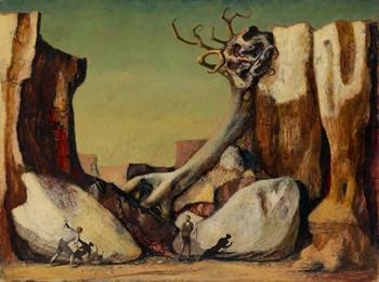 Early paintings such as Man Feeding His Dogs, 1941 (Queensland Art Gallery ǀ Gallery of Modern Art) clearly show the feeling and familiarity that Drysdale had for rural subjects, as well as his ability to express this in paint. A commission in 1944 to accompany writer Keith Newman through western New South Wales and record the devastating effects of the drought for the Sydney Morning Herald, added another dimension. This experience expanded Drysdale’s visual repertoire with images and motifs which depicted the country in such an extreme state that it appeared surreal and otherworldly. In subsequent paintings, a palette of rich ochres and black echo the parched landscape, while the dead trees, animal carcasses and remnants of human habitation provide graphic reminders of its harshness. As Newman wrote, ‘The dust-laden air plays eerie tricks with light. The sky appears leaden… crossed by great bands of black, red and grey… The sun is entirely obscured, or shows like a wan full moon. Dead trees… loom through the hot murk in a variety of fantastic shapes as though they died in agony beneath the axe or tortured by thirst as the wind below the soil from their roots… Worse than the skeletons of animals are the skeletons of homes.’6