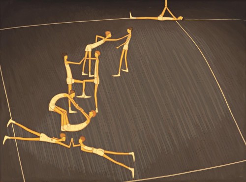 While the colour, movement and fantasy of competitive ballroom dancing offered rich visual inspiration for Brack’s picture-making, it was the way in which this activity reflected aspects of human behaviour and relationships that he found especially compelling. As an artist who was primarily interested in understanding and illuminating the human condition1, Brack found his subject matter in the people and places around him, depicting what he saw in a way that communicated both the physical reality as well as the underlying psychological motivations. While the Gymnast series of 1971 – 72 that followed was partly based on observations of his own children, it continued the themes of performance and partnership that he had explored in the ballroom dancing pictures, as well as notions of vulnerability and precariousness. As Brack said, in these paintings ‘the idea … is related to balancing and falling, but not absolutely collapsing … it is stumbling, but not the abyss’.2