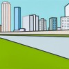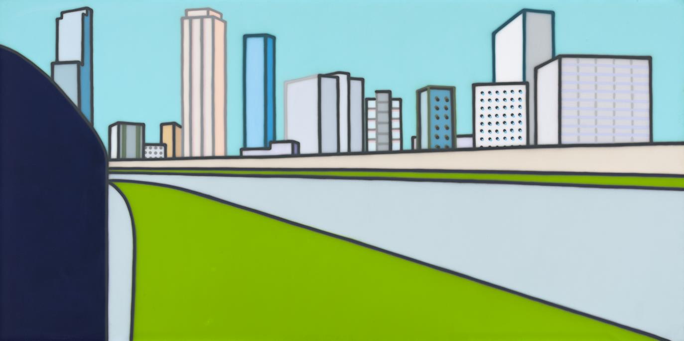 But the fact that we are heading somewhere is beyond dispute. The long expanse of grey siding draws us in, dragging us toward a left-hand exodus and avoiding the soulless generic city ahead. The fact that Arkley chose a verdant green for his tarmac, while utterly surreal, crystalises this odd sense of optimism.