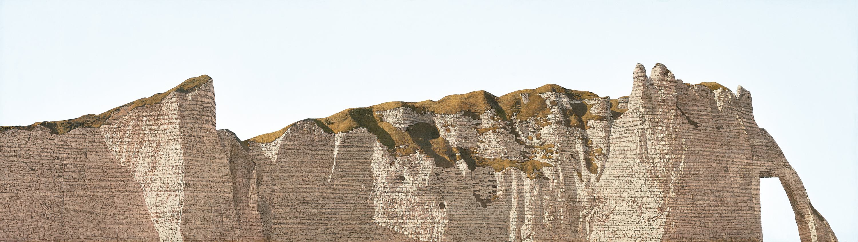 While Delafield Cook’s ongoing references to the work of Monet may seem incongruous given his vastly different approach to painting, it was, rather, the Impressionist’s subjects that interested him, affording the catalyst or springboard from which he would pursue his own pictorial investigations. Earlier in the decade, he had experimented with the idea of adopting a particular motif in his Waterlilies, 1972 – 73 (Art Gallery of New South Wales, Sydney), and now in 1978, he visited a place that had been a great source of inspiration to Monet – the cliffs at Étretat in Normandy on the north coast of France.3 From Delacroix to Courbet, Monet and Matisse, generations of artists had been attracted to this location by ‘the beauty of its light and its famous chalk cliffs which the sea had worn away to form three arches and a solitary ‘needle’’.4 Incorporating the same distinctive curved arch of the rockface that punctuates the interpretations of Monet and Courbet, A French Cliff nevertheless departs markedly from any artistic precedents – not simply in its obvious technical differences, but more importantly perhaps, in the antipodean’s choice of emphasis. Where previous artists had explored the connections between the rocks and ocean, Delafield Cook here focuses instead upon a broader expanse of the cliff face extracted from its surroundings – concentrating on the undulating contours capped by patches of grass, the minute horizontal geological situations, and the striking, raking light and shadow.5 With its long narrow horizontal format accentuating the expansive nature of his depiction, the composition offers an intensely vivid evocation of surface and substance that transforms the seemingly familiar into the extraordinary – inviting the viewer to contemplate the visible until we are drawn intuitively to that which lies beyond the physical realm.