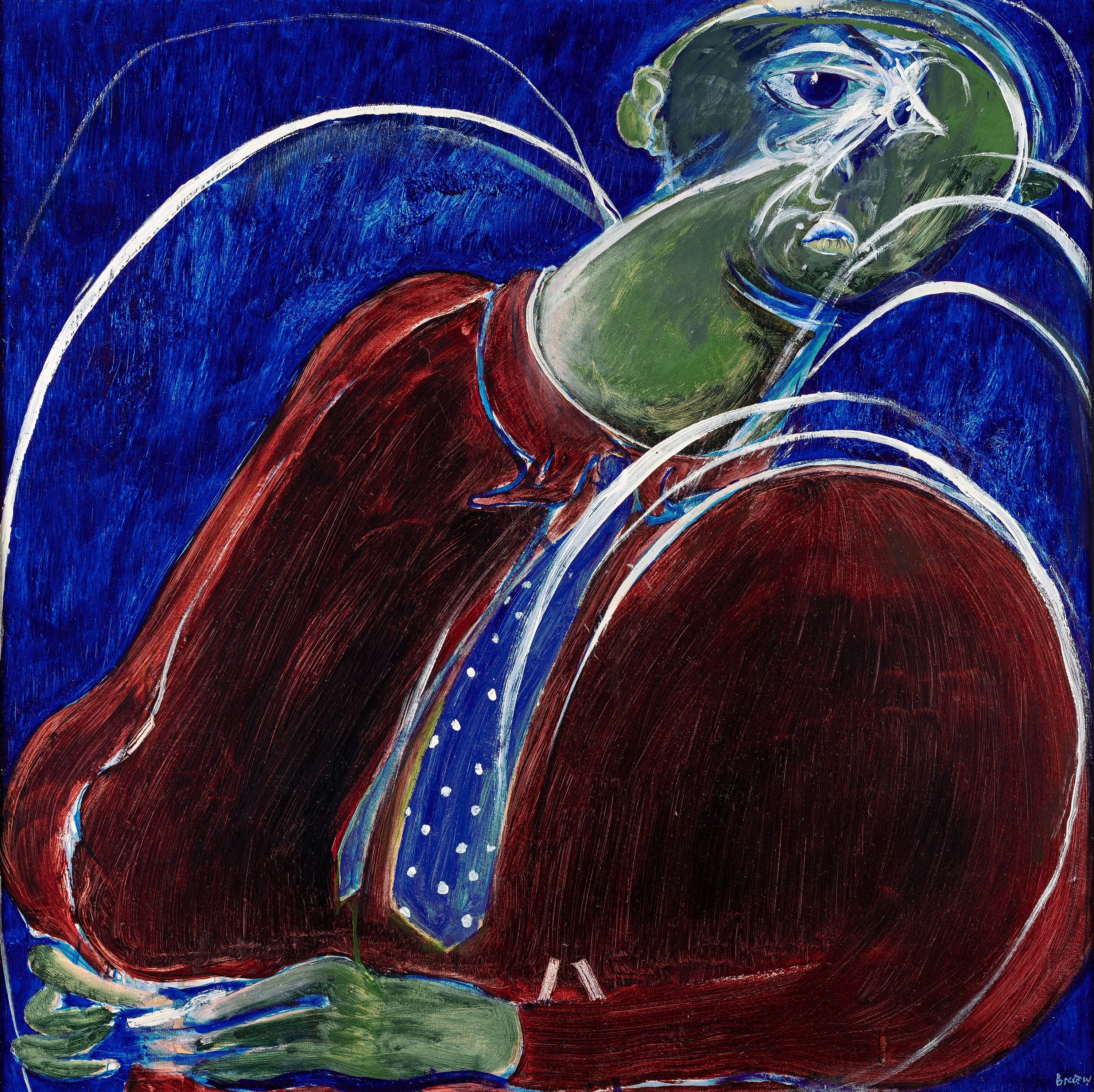 The bird was a recurring motif for Whiteley, and birds, eggs and nests occur as subjects, and as real-life collage elements, across the artist’s oeuvre. A favourite animal since childhood, he remarked in later years: ‘People ask me “why paint birds?” and I look at them dumbfounded! I’ve got no answer, except that they are the most beautiful creatures’.5 The Frenchman was painted during a period in which Whiteley was increasingly captivated by birds, having held an exhibition of bird images at Sydney’s Robin Gibson Gallery in 1983, followed by the solo exhibition Birds, at his Surry Hills studio.6 The protagonist’s torso fills the composition, his profile assuming a distinctly beak-like form while the confident white brushstrokes that curve around the lines of his body create a sense of wings flapping or feathers being ruffled to puff up a body against the cold. Despite the distinct marker of the shirt and tie and the subject’s large, clasped hands at the bottom of the image, Whiteley creates a portrait of a man at a moment of transition, as he cranes his neck and twists his body, as if hoping for escape – for flight – beyond the frame.
