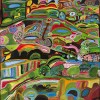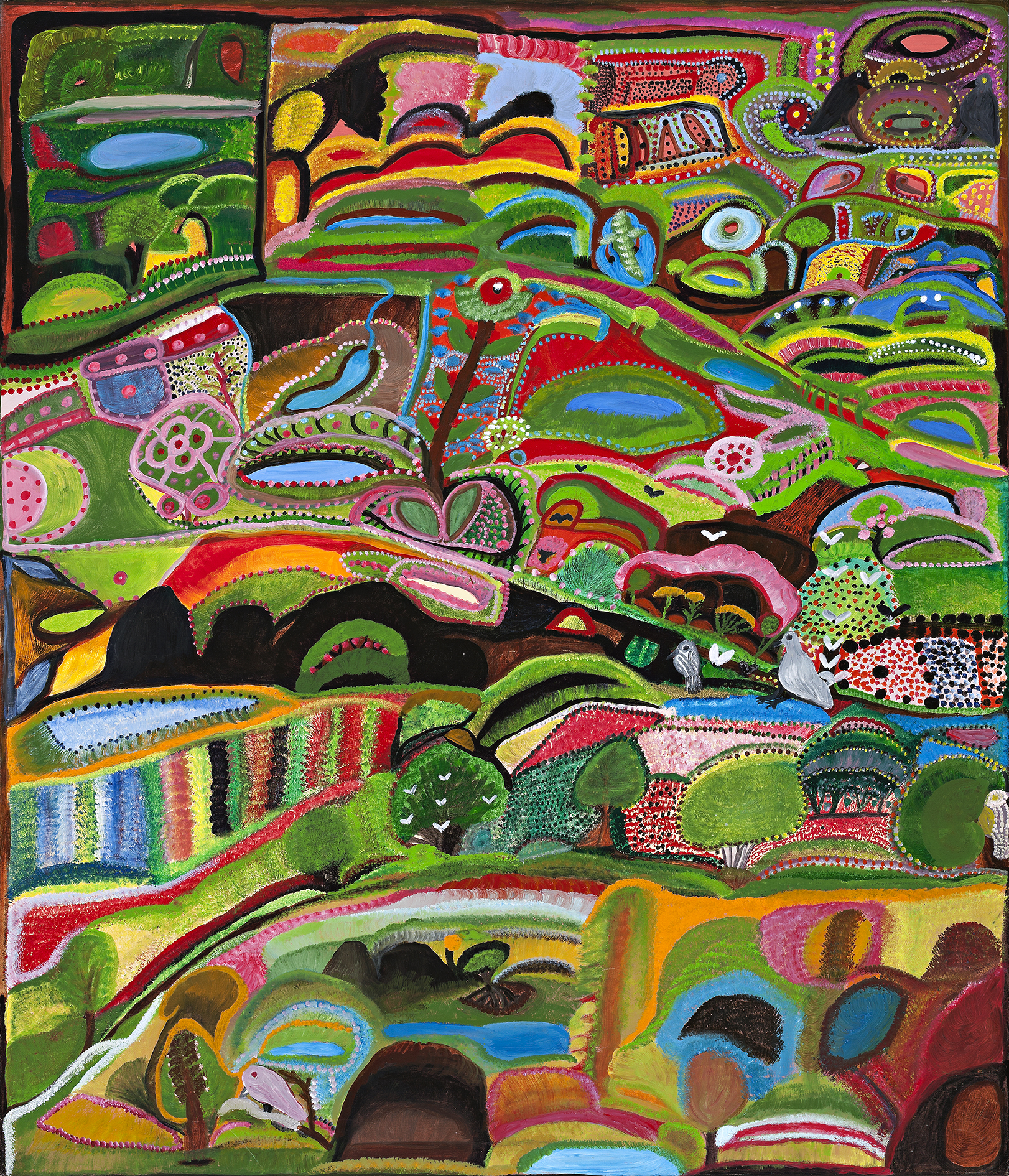 Gertie includes the wide variety of grasses, the rocky outcrops, and the pockets of bird life circling around the waterholes.Throughout the painting – birds, traditional baskets and other material cultural objects including tools and weapons are literally woven into the elements of the landscape. They appear as part of the landscape and demonstrate the intimate relationship between Gertie and her country."