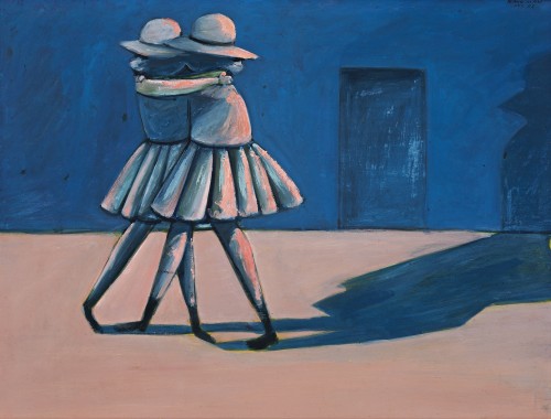 The exhibition at Peter Bray Gallery, Melbourne, was Blackman’s first solo presentation in a commercial gallery and The Friends, 1953 was one of fifteen paintings shown alongside related drawings and lithographs. With its dramatic contrast of light and dark shadow, limited colour palette, dynamic composition and sparse pictorial detail, The Friends has all the hallmarks of the best paintings in the series. Two schoolgirls are depicted in a tight embrace, the rhythmic pattern of their pleated skirts contrasting with the staccato depiction of their legs. The shadow cast by the two schoolgirls merges into a single united form and leads the eye to the only other detail in the picture, a dark doorway that beckons with a strong sense of foreboding. Reviewing the exhibition Alan McCulloch enthused, ‘In Blackman’s hands … Neilson’s schoolgirl becomes a creature of endless aesthetic possibilities … this young artist has created a series of paintings which are at once exciting and extremely stimulating.’4 While there was no consensus of critical opinion about the exhibition at the time, Blackman’s Schoolgirls are now regarded as one of the most significant groups of modern works produced in Australia during the immediate post-war years.