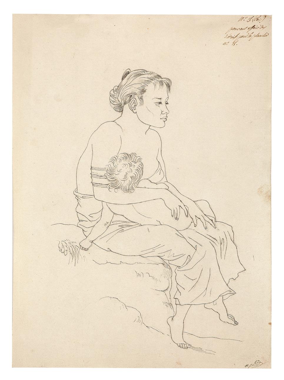 This is a more highly refined drawing than the preceding portrait, its simplicity reflecting Petit’s neo-classical training, and the ability to compare the two works together so closely gives an insight into his technique. Especially given that no other version of the portrait is apparently known, the complementary nature of the two pictures becomes more important than ever. While the previous drawing is far more detailed around the face but extremely cursory in its depiction of both the appearance of the child and the woman’s flowing dress, both of the latter aspects are much more clearly defined here.