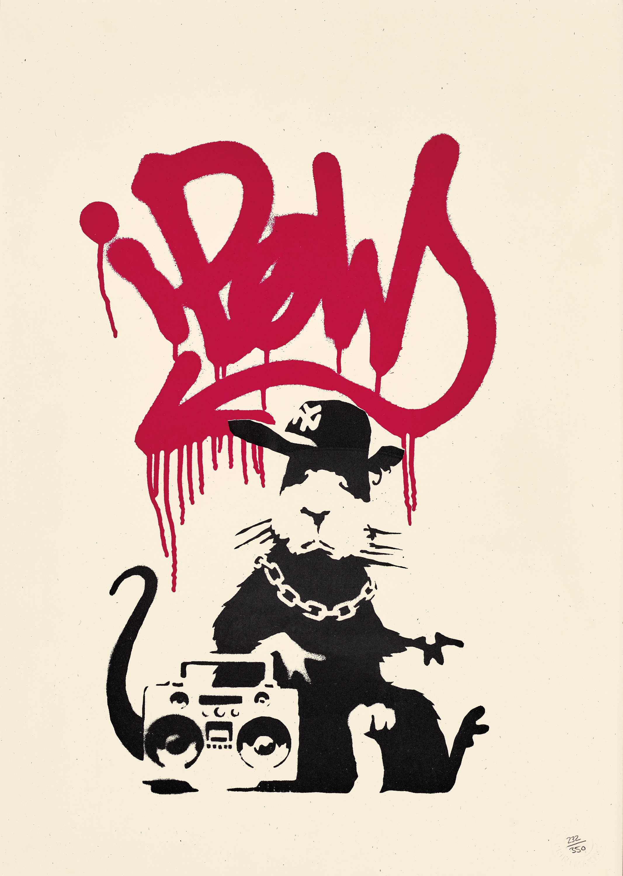 Personified rats have been an enduring motif in street artist Banksy’s oeuvre, often depicted in slapstick freeze frames and comically dressed to reflect salient contemporary issues in Britain and abroad. Understood by many to be a homage to Blek le Rat, Xavier Prou, the French pioneer of stencil art, Banksy’s rodent alter-egos exist on the fringes of society. Living invisibly in alleyways and undergrounds, much like clandestine graffiti artists, for Banksy these animals have come to symbolise freedom and resilience. Like many of his artworks, the Gangsta Rat, 2004 of this limited-edition screenprint first appeared stenciled directly onto a wall, in the London suburb of Farringdon in 2004. Shortly thereafter, with the artist-run publishing cooperative Pictures on Walls, Bansky printed Gangsta Rat in black and red in an edition of 350, with an additional 150 prints hand-signed. Circumventing commercial gallery structures, examples of these prints were sold directly to buyers through the internet and pop-up exhibitions. While Banksy created over 30 different street artworks using rats in the 1990s,1 Gangsta Rat was the first design to be screenprinted, preceding the other ‘Rat Pack’ editions such as Love Rat, Placard Rats – holding signs emblazoned with ‘Because I’m Worthless’, ‘Welcome to Hell’ and ‘Get out while you can’ and Radar Rat.