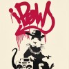With hands held aloft and a look of surprise etched into its white face, Gangsta Rat appears to have been caught playing dress-up. Wearing a side-ways New York Yankees baseball cap, an earring and chain medallion necklace, the rat sits beside a Boom Box portable stereo system, imitating the flashy style of American hip hop and rap artists of the 1980s. Tagged in dripping red spray paint above the rat are the letters iPOW, referencing Bansky’s print publisher Pictures on Walls and imitating the nonsensical marketing jargon of large corporations in the early 2000s. Banksy’s trussed-up rat derides both the opportunistic bastardisation of popular culture to sell products, and the mindless rat-race of consumer culture.