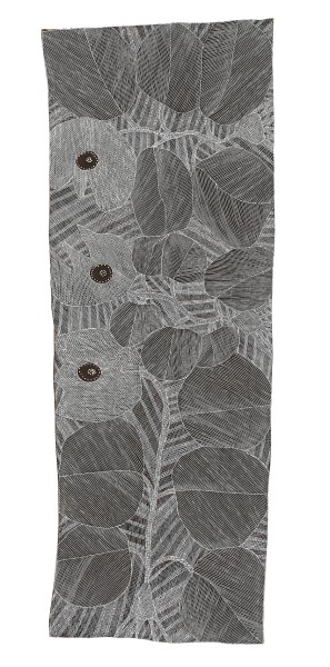 This work is accompanied by a certificate from Buku-Larrngay Mulka Arts which states: ‘This work represents Garrimala, a billabong near the artist’s residence, the Dhalwanu clan homeland at Gängan. It is a sacred site for the artists’ mother’s Gälpu clan. But this imagery really refers to perhaps the oldest continuous human religious iconographical practice – the story of the Rainbow Serpent in West Arnhem Land rock shelters. Wititj is the all-powerful Rainbow Serpent (olive python) that travelled through Gälpu clan lands and on further, during the days of early times called Wanarr. Djaykun the Javanese file snake is a companion and possible alternate incarnation of Wititj, living in amongst the Dhatam, or waterlilies, causing ripples and rainbows (djari) on the surface of the water (one reference in the cross hatching).’