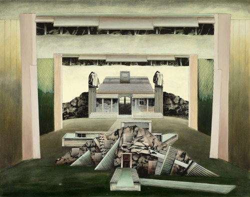 ‘The Gate Beyond the Gate, 1976 was painted while Jan Senbergs was living in Canberra on an Australian University Creative Art Fellowship from 1975 to 1976. His works of this period are characterised by a general lightening of colours, with the introduction of earth colours and green to offset the sombre blacks of his earlier works. From the mid 1960s, Senbergs began incorporating photo-stencil silkscreen painted images directly onto his canvases; to enhance their clarity he used predominantly dark contrasting colours like black or dark brown. The images of his 1970s works, like the abstract shapes of his earlier works, were chosen for their formal visual qualities often from his photography or printmaking, their source being magazines, newspapers or enlarged photographic segments of objects in his studio such as worn clothing or chairs. These elements were then constructed into surrealist landscapes which, because of the fragmented quality of the imagery, are often taken as symbols of destruction with the dark palette having connotations of pessimism. They are often interpreted as a vision pf apocalyptic doom and the destruction of civilisation, although they are principally intended by the artist to be visual formalist statements. Many of his paintings of this period tend to have a central path leading back into the picture as if representing a metamorphic journey into the past for he incorporates direct architectural references into his Canberra works, recording through buildings, rather than people, the progression of time.’1