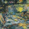The present example, Girl with Corn Hair, as inscribed verso by the artist is slightly misleading, as observation gently reveals that there are in fact four figures delicately embedded into the painting. The figures are so immersed into the surrounding landscape that they are barely discernible. One figurative touchstone which Passmore allows himself in this work are the deftly painted toes on the feet of the figures, which are visual pointers to the human forms and as such, become tiny gateways to the work. Typically, rhythms of light and shade flood his work, his repertoire of greens and yellows flicker and jostle as they compete for prominence. A dappled light falls across the work which adds to the idle, languid scene. No area of the painting is given more importance than another, and in this regard the synergy between the figures as subject and landscape as ground is crucial to Passmore’s attempts to create a culminated structure in his work. As John Olsen reflecting on Passmore says ‘…He spoke of his desire to create a work which… following Dylan Thomas’s suggestion of the sympathy between man and his environment he could find a way of becoming one with the natural forms he painted.’1