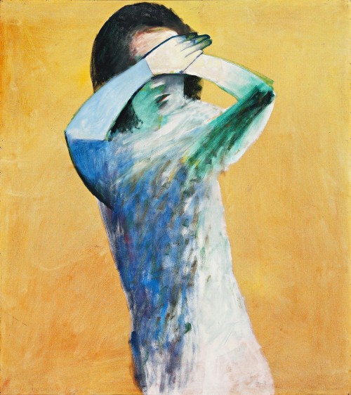 As the artist’s wife Barbara noted, ‘When we returned to Australia in 1966, Charles was famous. Collectors all wanted Blackmans, dealers wanted pictures to sell, galleries wanted shows. We got caught up in the high life: parties, media, photographs’.1 Whilst Charles set about building the studio with Halifax Hayes, Barbara, a noted poet in her own right, turned ‘the new sitting room opening onto the courtyard garden into a venue for dinner parties, musical events, poetry readings and theatrical performances’.2 Attunga Avenue thus became a home full of creative enterprise and their son, Auguste, recalls that Girl Hiding was one of the first paintings his father painted there, and may be interpreted as his direct response to the unique light of Sydney following five years of English skies.3 Not surprisingly, the girl is shown shielding her eyes from the glare, surrounded as she is by the warmth of sunshine yellow; but this gesture characteristically echoes many of Blackman’s other signature paintings, where his protagonists shield their identity from outsiders and inhabit their own world of inner thoughts. ‘Charles' formidable and sensitive understanding of the complex feminine psyche, the tender, human fragility and the potent mythic qualities of the underworld, are touched upon and culminate in this painting. She is vulnerable, but she is not weak. She is casting a spell of her own making’.4 The rapid gestural marks delineating the body further emphasise the girl’s quick movements as if she has just become aware of observers and attempts to block them from her view. Intriguingly, Blackman chose to paint on the reverse, toothed side of the board and the textural pattern provides an optical ‘hum’, not dissimilar to the Op Art movement which had risen in prominence in London during the artist’s last years there. As ever, Blackman found a way to synthesise his individualistic figurative motifs within the aesthetics of otherwise contemporary art movements.