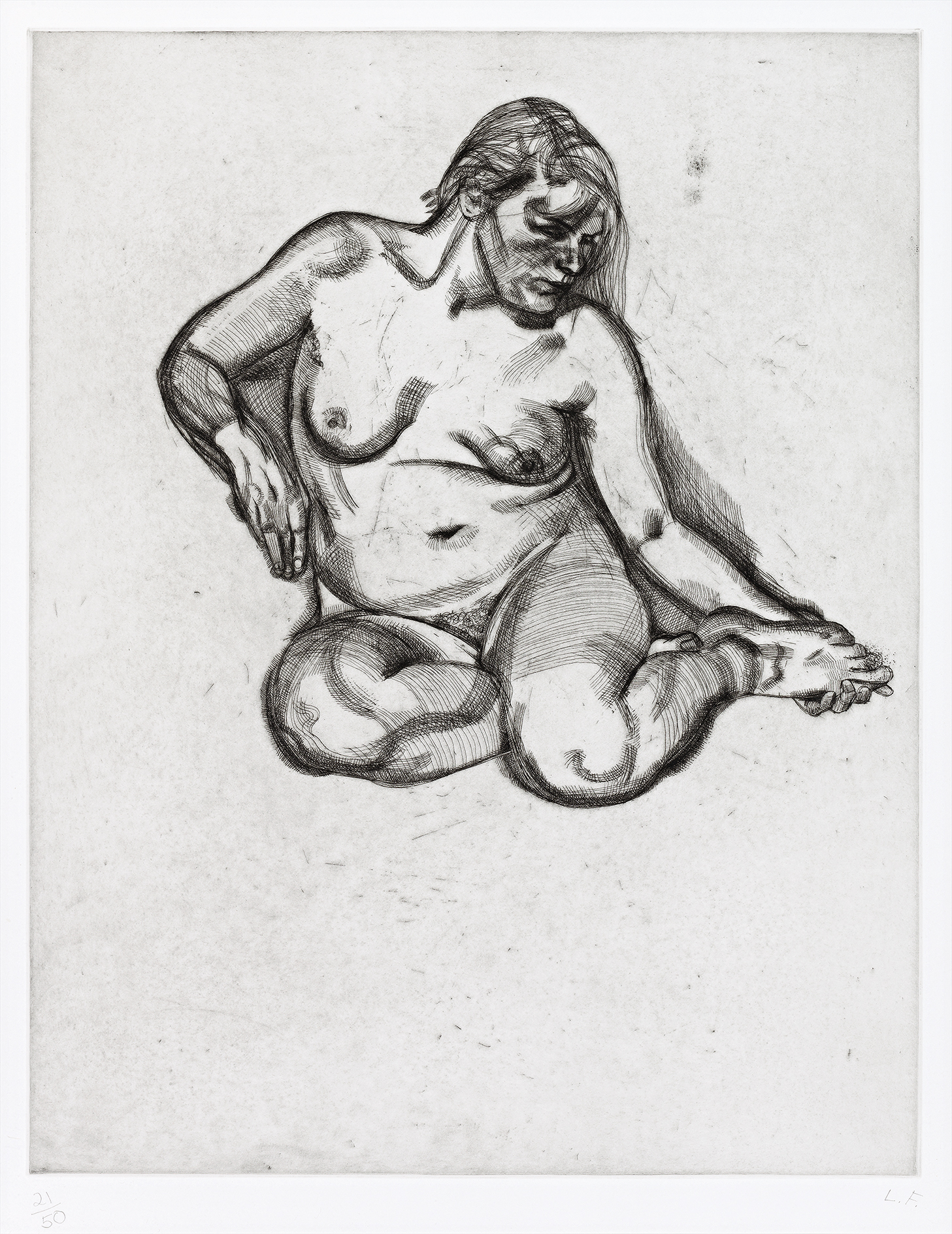 Freud, particularly in his etched works, depicted his sitters with a palpable weight and physicality. The negation of spatial context, props and background in many of the artist’s printed works of the 1980s, particularly Girl Holding her Foot, Blond Girl and Woman Sleeping, create a strange, almost surreal effect in which the sitter appears to float in a void, hovering in a way that directly contradicts the strong, weight-bearing contours of their bodies.
