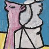 Ten months later Nolan married Elizabeth Paterson, and in 1940 the young couple moved into a rundown tenement studio opposite the Melbourne Museum in Russell Street. Importantly, its walls had been painted a ‘shocking pink’ by a previous tenant 2 and it is tempting to recognise this as the impetus for the numerous candy pink, blue and yellow paintings that tumbled from his brush over the next two years. Girl on Horse is an early member of this series and displays the strong influence of paintings from the 1920s and 30s by Picasso, Leger and Klee with ‘flat planes of bold colour separated by thick black lines.’3 Apart from the Russell Street location, Nolan temporarily shared a studio in St Kilda with John Sinclair. In between periods of painting, he spent many enjoyable hours watching horses being exercised in the shallow waters of the bay and this return to his childhood roots also triggered memories of fairgrounds. Significantly, Nolan had used a circus tent motif the previous year in his theatre designs for the ballet Icare presented by Colonel le Basil and Serge Lifar but the tent-like compression seen here in Girl on Horse is also informed by contemporary commercial art which was already ‘including cubistic fractured imagery, non-recessional space, abstracted line pattern and flat, bright colours.’4 Bold and assured (and painted on a preciously rare piece of war-time canvas), Girl on Horse remained in the artist’s possession for many years before passing to Nolan’s long-term English studio assistant John Hull. It is also the antecedent for a slightly larger version exhibited at the Contemporary Art Society, Melbourne, in 1941.