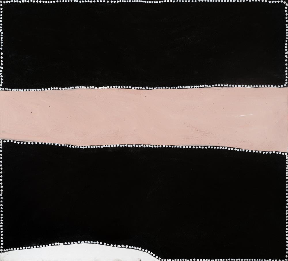Girlingmanji (Twenty Mile), 2001 is catalogued as painting PB 3.2001.107 in the artist's chronological index of works, and was produced in the middle years of the artist's painting career. It exemplifies Bedford's move away from the familiar style of the earlier east Kimberley painters. With his elimination of the ochre palette and introduction of starkly contrasting black and white, the interplay between positive and negative space is highlighted and the form becomes dominant.
